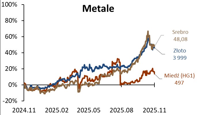 AF: umocnienie USD (jako efekt malejącego prawdopodobieństwa grudniowej obniży stopy referencyjnej Fed) osłabia notowania metali (które są w USD) i zachowanie USD będzie miało kluczowy wpływ na notowania metali.