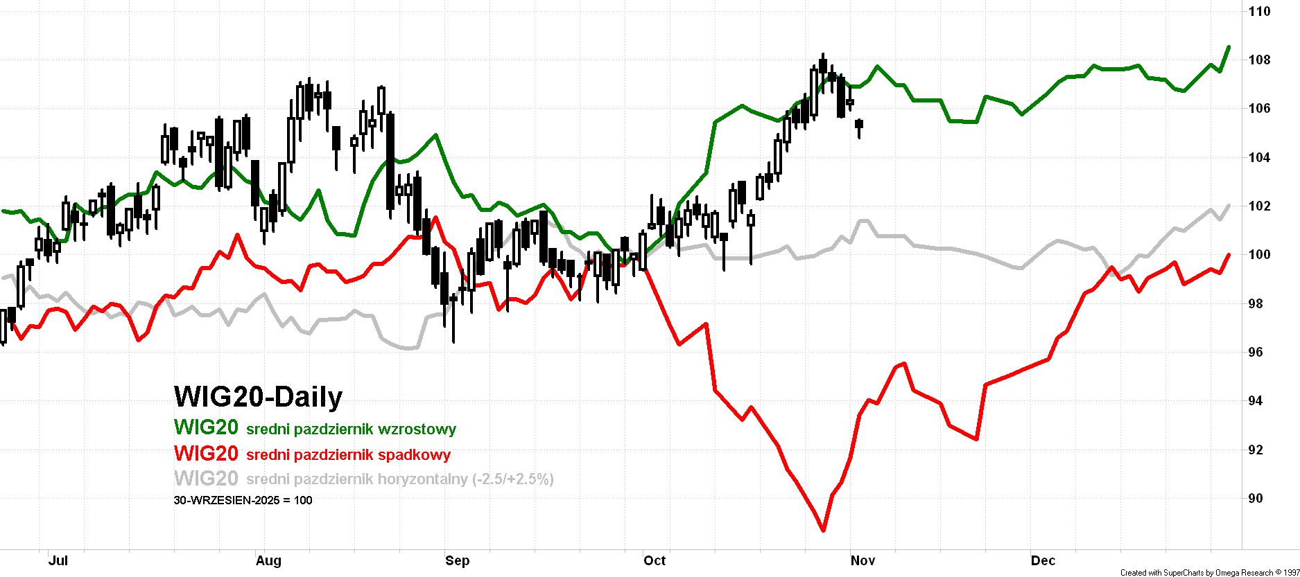 Z punktu widzenia zachowania WIG20 w poszczególnych miesiącach roku wyrazistą cechą niedawno zakończonego października jest największa na tle pozostałych miesięcy liczba stóp zwrotu wykraczająca poza przedział zmian, które można określić mianem niewielkich (umownie od -2.5% do +2.5%). Październikowe przejście na byczą, bądź niedźwiedzią stronę odbywa się więc zazwyczaj bardzo zdecydowanie, a to z kolei powoduje, iż często pojawiające się na progu każdego miesiąca szacunki dotyczące kierunku dominującej w nim koniunktury stają się w tym przypadku szczególnie warte wysiłku. Próbując wykorzystać do tego celu podobieństwo do wykresów sezonowych pogrupowanych wg kryterium wzrostowego, spadkowego, bądź horyzontalnego października (odpowiednio linie zielona, czerwona i szara), o ile obecnie zdecydowanie można było odrzucić wariant ‘spadkowy’, to pierwsza połowa miesiąca zapowiadała wynik raczej gorszy od wzrostowej przeciętnej. Okazało się jednak, iż końcowy kształt notowań nie odstawał już znacząco od typowego wariantu wzrostowego.