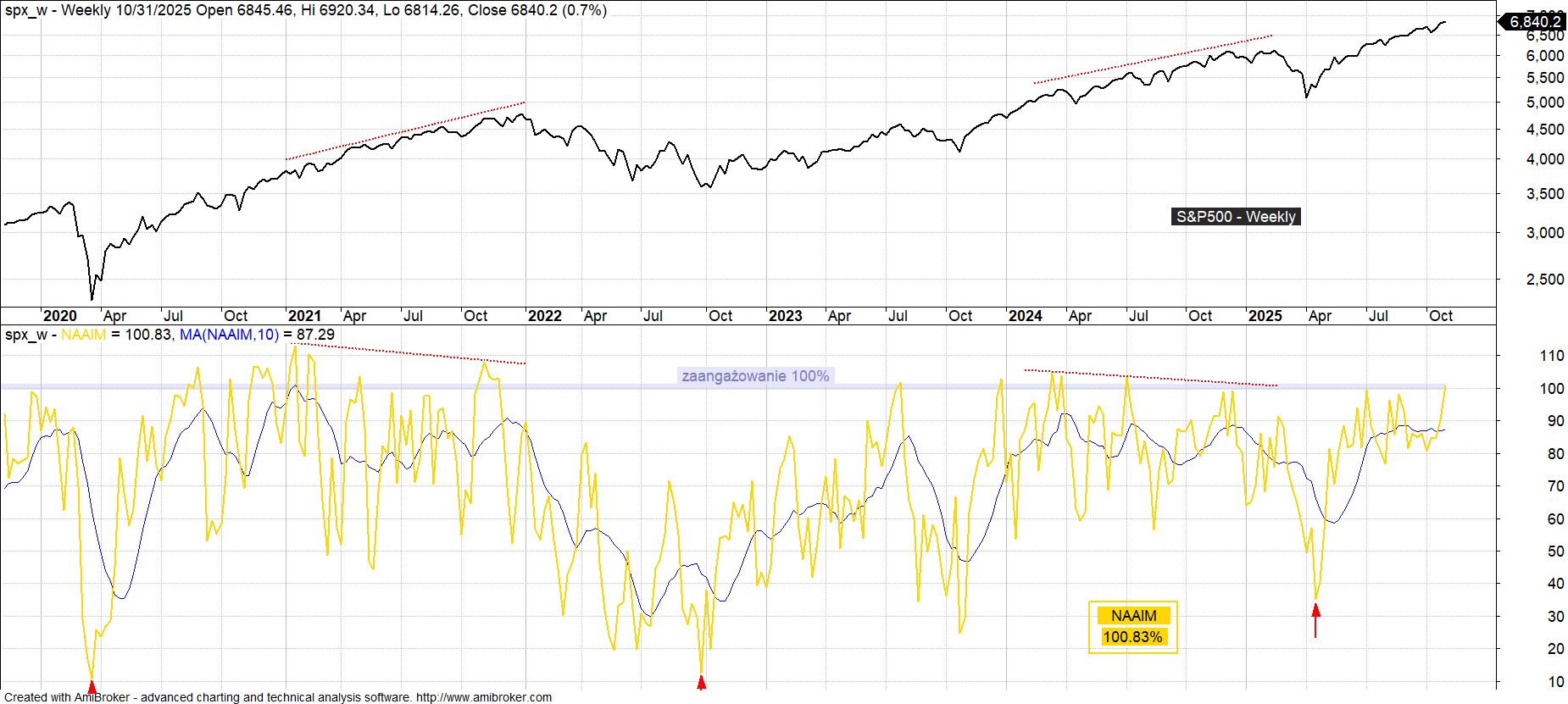 Obliczane przez The National Association of Active Investment Managers (NAAIM) średnie zaangażowanie aktywnych zarządzających w ostatnim tygodniu wzrosło z 90.3% do 100.8%. Tym samym po raz pierwszy w bieżącym cyklu można w ogólnym ujęciu mówić o lewarowaniu długiej pozycji w akcjach (poprzedni maksymalny odczyt datujący się jeszcze na lipiec wynosił 99.3%). Choć lewarowanie z pewnością jest oznaką bardzo wysokiego optymizmu, to jak pokazuje historia, w kontekście długoterminowych perspektyw jeszcze nie wiąże się ono z kontrariańskim ostrzeżeniem. Za takowe należałoby uznać dopiero serię szczytów powyżej pułapu 100% z jednoczesną budową dywergencji. Natomiast na krótką metę jest to z pewnością czynnik sprzyjający korekcie cen na rynku akcji.