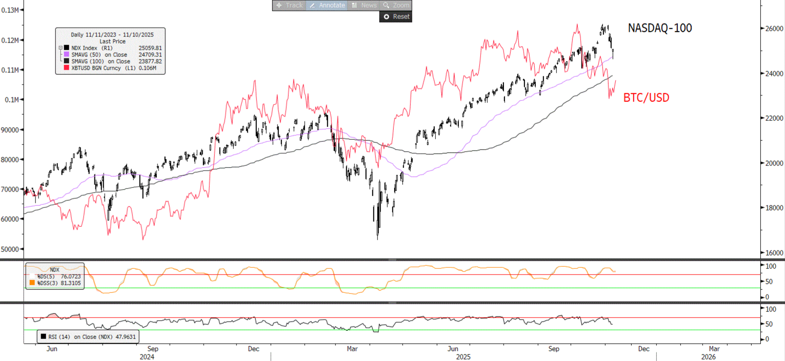 Obrona przez BTC/USD wsparcia na 100000 USD sprzyja aktywizacji strony popytowej, co pośrednio wspiera sentyment do NASDAQ-100,