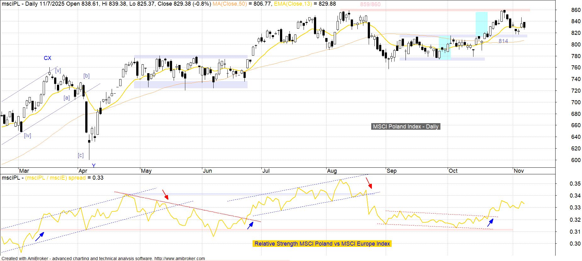 Kluczowy z punktu widzenia inwestorów zagranicznych indeks MSCI Poland przed dwoma tygodniami zrealizował wynoszący 855 pkt potencjał wzrostowy odpowiadający szerokości opuszczonej wcześniej 1.5-miesięcznej konsolidacji. W ramach tego ruchu udało się jeszcze o niespełna punkt poprawić dotychczasowy tegoroczny rekord 859 pkt z połowy sierpnia, po czym w reakcji na rozpoczęte po szczycie z 29 października cofnięcie na rynkach bazowych kurs powrócił w pobliże lokującego się na wysokości 814 pkt górnego ograniczenia wspomnianej wcześniej konsolidacji. W tej sytuacji pułap 859-600 pkt uzyskał znaczenie oporowe. Natomiast do czasu utrzymania 814 pkt możliwy będzie kolejny jego test, co zapewne wymagałoby jednak podobnego zachowania rynków bazowych.