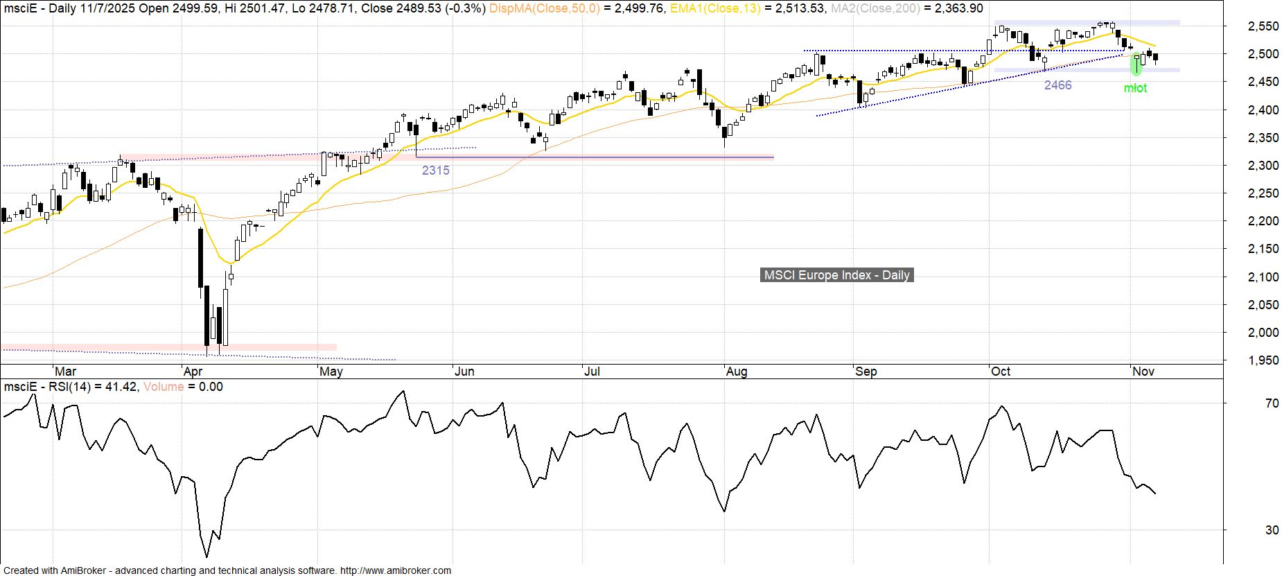 Dla skupiającego 15 europejskich rynków rozwiniętych indeksu MSCI Europe wyznaczenie nowego rekordu wszechczasów po ostrej przecenie z pierwszej połowy kwietnia okazało się kwestią niespełna miesiąca, co wypada uznać za duże pozytywne zaskoczenie, z którym wiąże się sygnał wejścia w nową falę hossy po blisko rocznej rozszerzającej się konsolidacji. W tej perspektywie główną linią obrony pozostaje pułap 2 315 pkt. Na krótką metę natomiast w ramach rozpoczętego końcem października globalnego cofnięcia doszło do anulowania mającego miejsce przed miesiącem wybicia z budowanego od sierpnia trójkąta. W tej sytuacji wzrasta prawdopodobieństwo wejścia w większą korektę, choć dalsze utrzymanie minimum sesji z ostatniego wtorku (bycza świecowa formacja młota) dopuszcza także scenariusz konsolidacji z dolnym ograniczeniem 2 466 pkt.
