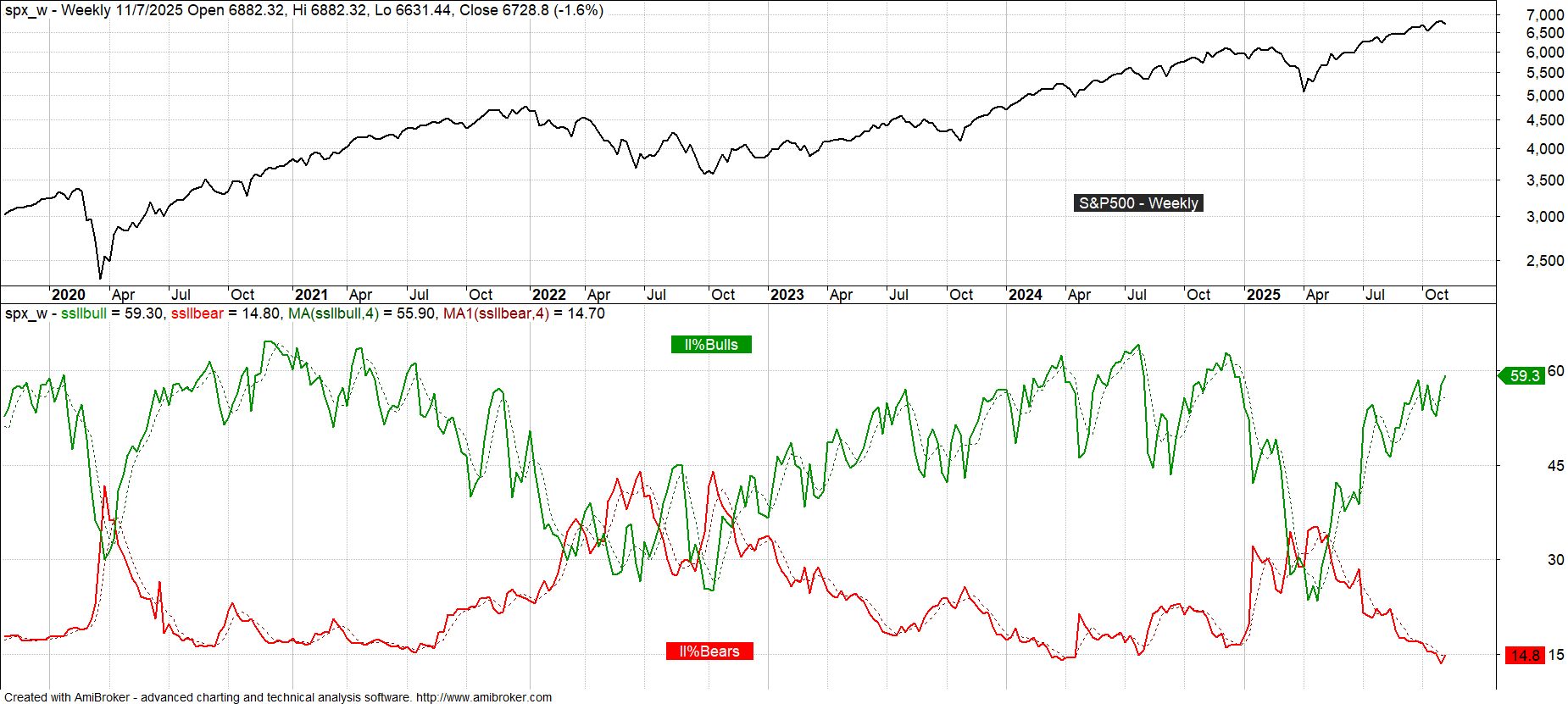 Pośród amerykańskich wskaźników sentymentu jednymi z najbardziej istotnych są wyniki prowadzonych przez Investors Intelligence cotygodniowych badań rynku biuletynów inwestycyjnych. W najnowszych odczytach ma miejsce wzrost odsetka byczych zaleceń (II%Bulls) do najwyższej w obecnym cyklu wartości 59.3%, poprzednio natomiast zanotowano najniższą od 2018 roku wartość odsetka zaleceń niedźwiedzich (13.5%). Dostrzegając wysoki optymizm warto zaznaczyć, iż w długiej perspektywie z kontrariańskim ostrzeżeniem mielibyśmy do czynienia dopiero po więcej niż jednokrotnym przekroczeniu przez byki pułapu 60%, natomiast na krótką metę – podobnie jak w przypadku wskazań NAAIM – można tu mówić o środowisku sprzyjającym korekcie ostatnich zwyżek.