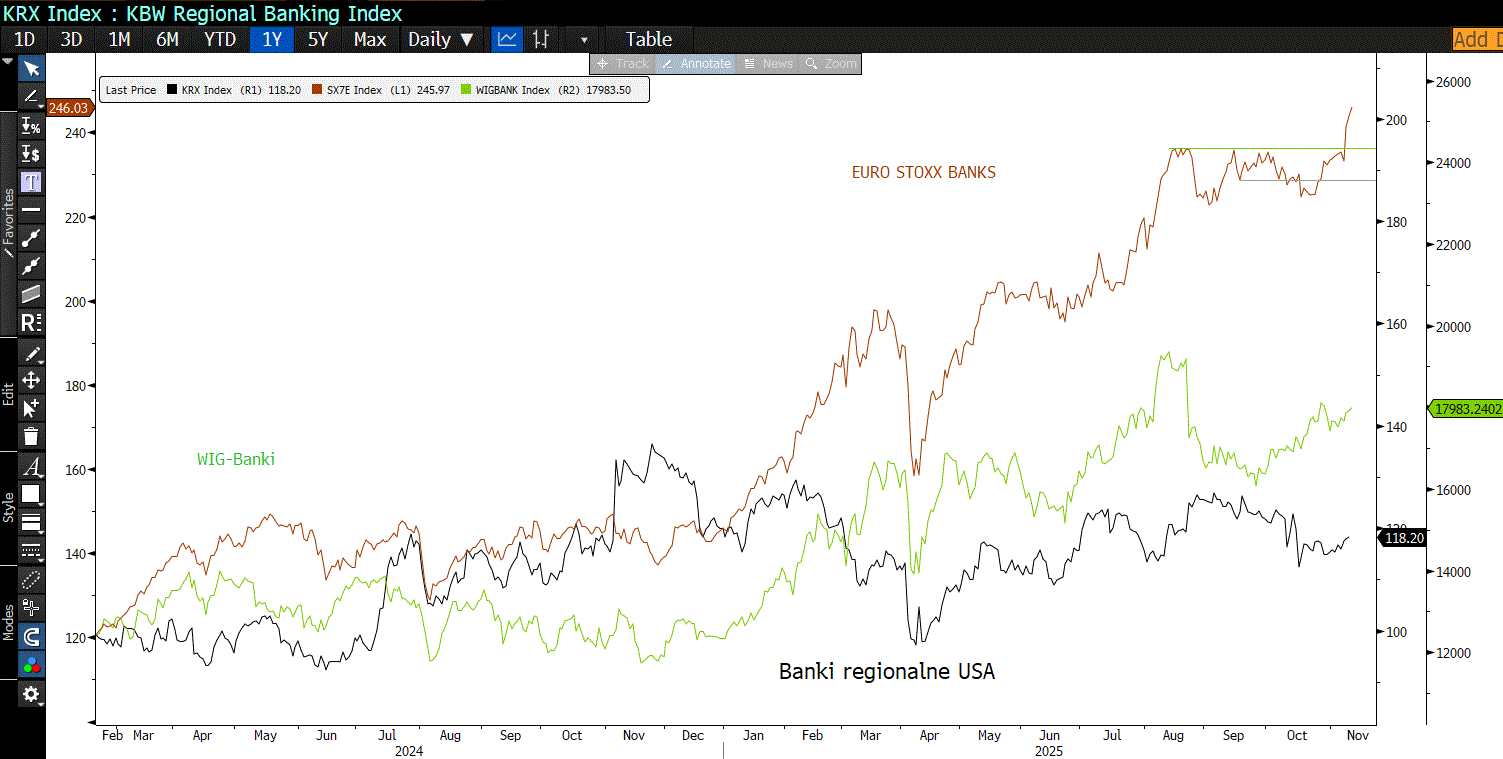Silne zachowanie EuroStoxx Banks i odbijanie indeksu banków regionalnych w USA jest otoczeniem wspierającym sentyment do polskich banków.