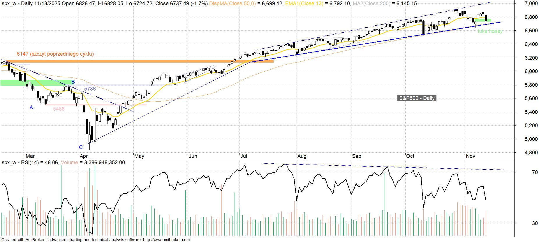 Końcem czerwca S&P500 wybił się ponad ówczesny historyczny szczyt 6 147 pkt z połowy lutego br., co ostatecznie ugruntowało kwietniowe sygnały zamknięcia najbardziej dotkliwego epizodu spadkowej fazy poprzedniego cyklu w formie typowej elliotowskiej struktury korekcyjnej ABC. Natomiast w kontekście oczekiwań pierwszej wyraźniejszej korekty w nowym cyklu na początek warto zauważyć, iż niedługo po przekroczeniu poprzedniego cyklicznego szczytu, dynamika zwyżki uległa wyraźnemu zmniejszeniu, co można wiązać z poprzedzającą okresowe schłodzenie dystrybucją. I choć założenie o dystrybucji w zasadzie nie zostało do tej pory podważone (przykładowo nadal nie doszło do przerwania budowanej od lipca negatywnej dywergencji z RSI), to należy też podkreślić, że spowolniona linia trendu z ostatnich miesięcy wyraźnie zyskała na znaczeniu, a sygnalizujące korektę wyłamanie może nadal odwlekać się w czasie. Ostatnim efektem wspierającego działania wspomnianej linii trendu było zeszłopiątkowe zatrzymanie rozpoczętego końcem października cofnięcia wyrazistą świecową formacją młota połączoną z późniejszą luką hossy 6 730 – 6 770 pkt. W końcowej fazie wczorajszej sesji luka ta została zamknięta, stąd nawet już nieznaczne pogłębienie spadku istotnie podważyłoby jakość ostatniego odbicia, sugerując kolejny test wspomnianej linii trendu. Gra idzie o możliwość przejścia do większej korekty jeszcze w obecnym kwartale (analogie związane z sentymentem), kosztem jej odsunięcia dopiero na 1Q’26 (wejście w słabszy okres z punktu widzenia cyklu prezydenckiego).