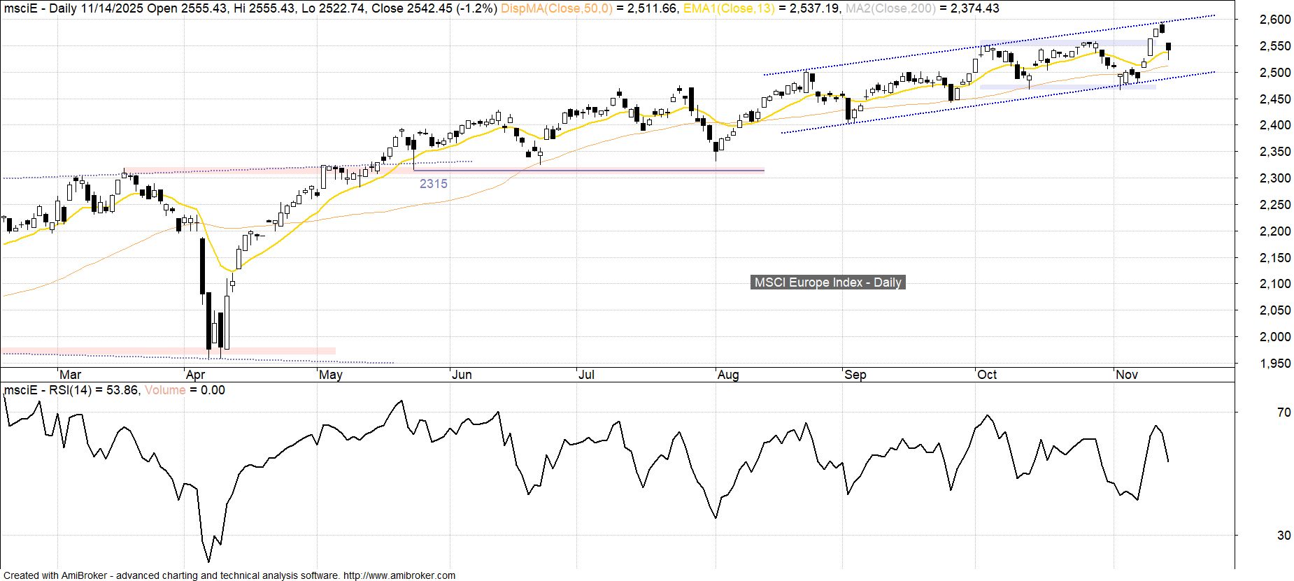 Dla skupiającego 15 europejskich rynków rozwiniętych indeksu MSCI Europe wyznaczenie nowego rekordu wszechczasów po ostrej przecenie z pierwszej połowy kwietnia okazało się kwestią niespełna miesiąca, co wypada uznać za duże pozytywne zaskoczenie, z którym wiąże się sygnał wejścia w nową falę hossy po blisko rocznej rozszerzającej się konsolidacji. W tej perspektywie główną linią obrony pozostaje pułap 2 315 pkt. Na krótką metę natomiast warto odnotować ubiegłotygodniową próbę wyjścia ponad październikowe maksima, co jednak na razie obywa się wbrew zachowaniu pozostałych rynków bazowych (USA i segment EM). W tej sytuacji raczej trudno oczekiwać, iż mogłoby dojść także do przełamania górnej linii kanału wzrostowego z ostatnich czterech miesięcy (obecnie ok. 2 600 pkt).