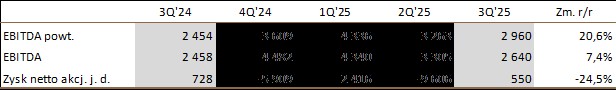 Spółka podała wstępne szacunkowe dane za 3Q25 (pełny raport zostanie opublikowany 25 listopada, dzień później planowana jest konferencja). Wyniki zostały obciążone skutkami zdarzeń jednorazowych związanych z wygaszaniem działalności produkcyjnej w El. Dolna Odra.