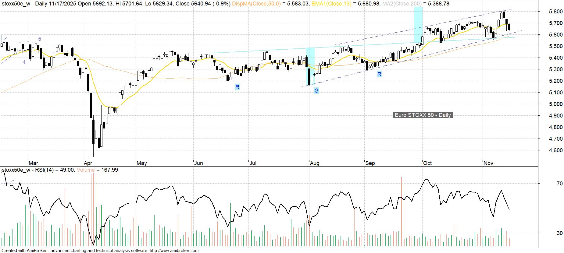 Indeks 50-ciu blue-chipów strefy euro początkiem października zdołał przełamać lekko nachyloną w górę barierę podażową poprowadzoną przez lokalne szczyty z lipca i sierpnia, którą w tej sytuacji można traktować jako linię sygnalną kilkumiesięcznej formacji kontynuacji w postaci odwróconej głowy z ramionami (oRGR). Wybicie od początku nie przebiegało zbyt dynamicznie, a po ostatnich trzech spadkowych sesjach realizacja potencjału wzrostowego sugerowanego przez wysokość opuszczonej formacji (ok. 5 850 pkt) jest nie pierwszy raz zagrożona. W szczególności ponownie mocniej wszedł do gry wariant budowanego od sierpnia kończącego klina, a do negatywnego rozwiązania tej formacji brakuje tylko spadku poniżej niedalekiego pułapu 5 600 pkt.