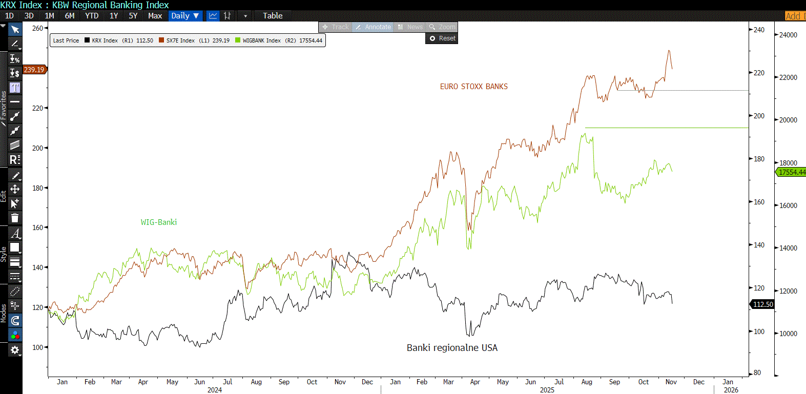 Analiza między rynkowa: słabość EuroStoxx Banks i banków regionalnych w USA jest wymagającym otoczeniem dla WIGBanki, choć nadzieją dla strony popytowej mogłoby być zawetowanie podwyżki CIT dla banków.