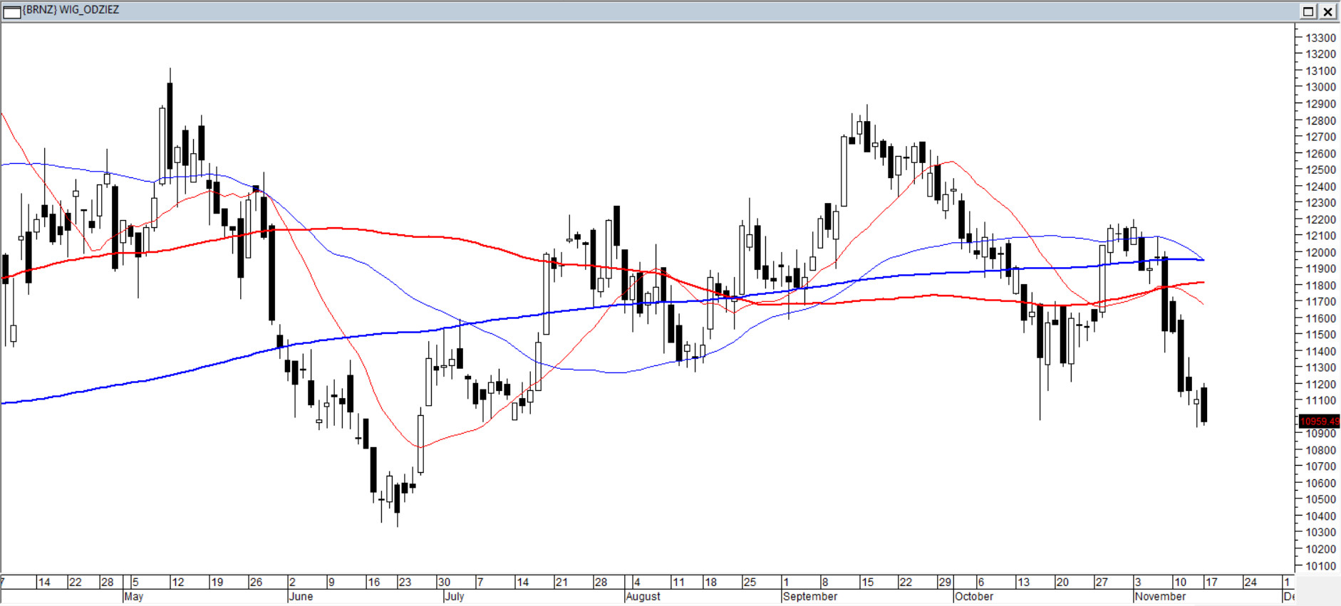 Indeks wybił w dół z październikowej konsolidacji i szybko znalazł się pod sekwencją średnich 15/45/100/200. Listopad jest zdominowany przez czarne korpusy, co wyraźnie potwierdza przewagę podaży. Wszystko to razem komplikuje mocarstwowe plany byków, zwłaszcza, że kurs znalazł się już najniżej od początku wakacji. Czerwcowe wsparcie (10400) to jednocześnie roczne minima. Można zatem założyć, że przebicie go dołem sprawi, iż WIG - Odzieżowy „ubierze się” w bessę.