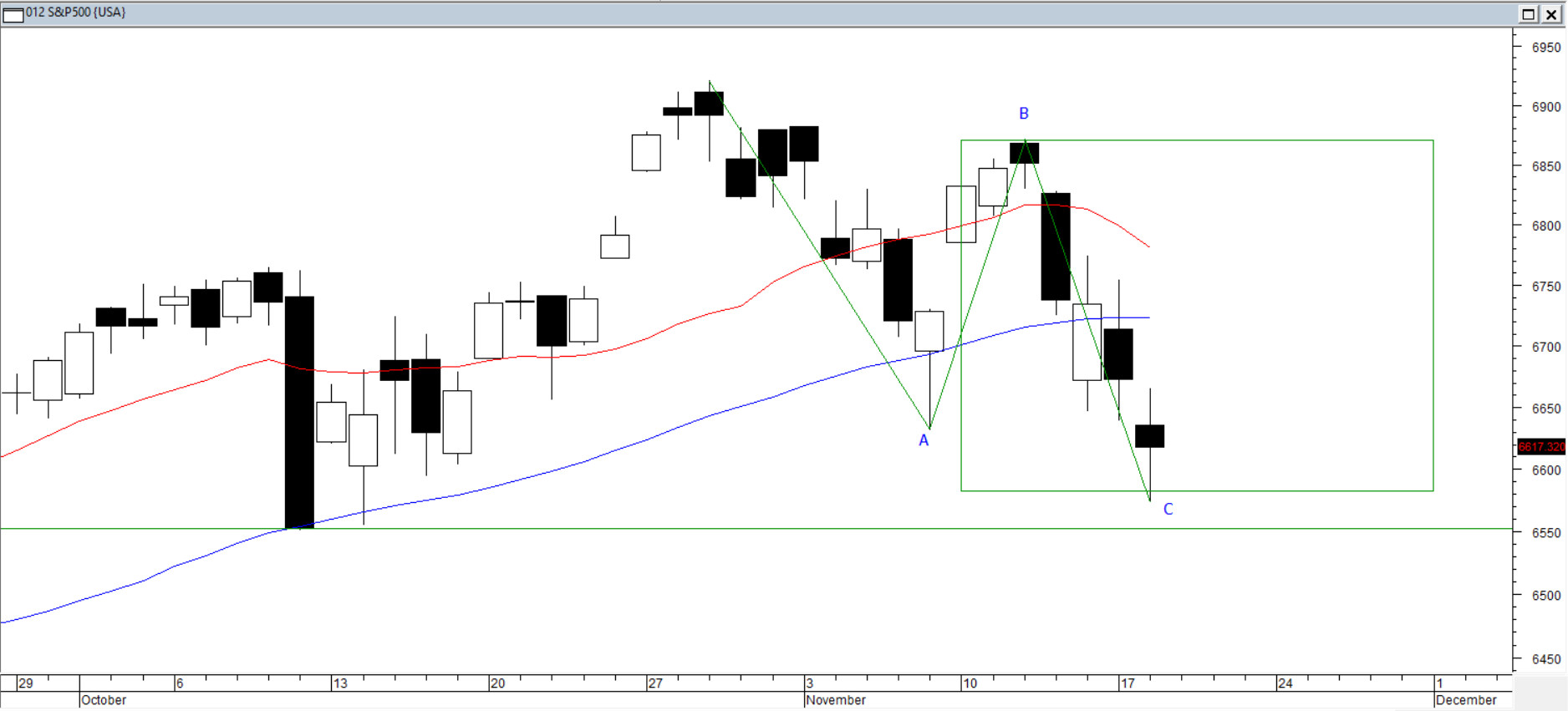 Środowa sesja przyniosła kontynuację ruchu spadkowego i sprowadziła indeks w okolice równości obu fal spadkowych widzianych od szczytu. Struktura na tę chwilę przypomina korektę regularną, ale warunkiem powodzenia popytu jest odrzucenie wtorkowego minimum i w miarę szybki powrót do trendu. W krótkim horyzoncie fani wzrostów mają jednak powód do niepokoju — Jest to jednak największy spadek indeksu od kwietnia, a jego dynamika nie daje komfortu interpretacyjnego. Średnie 15/45 układają się w wyraźną strefę oporu 6723–6780, która teraz staje się pierwszą barierą, jaką rynek musi pokonać, żeby odbudować momentum. Wsparcie z października 6551 pkt. nadal działa.