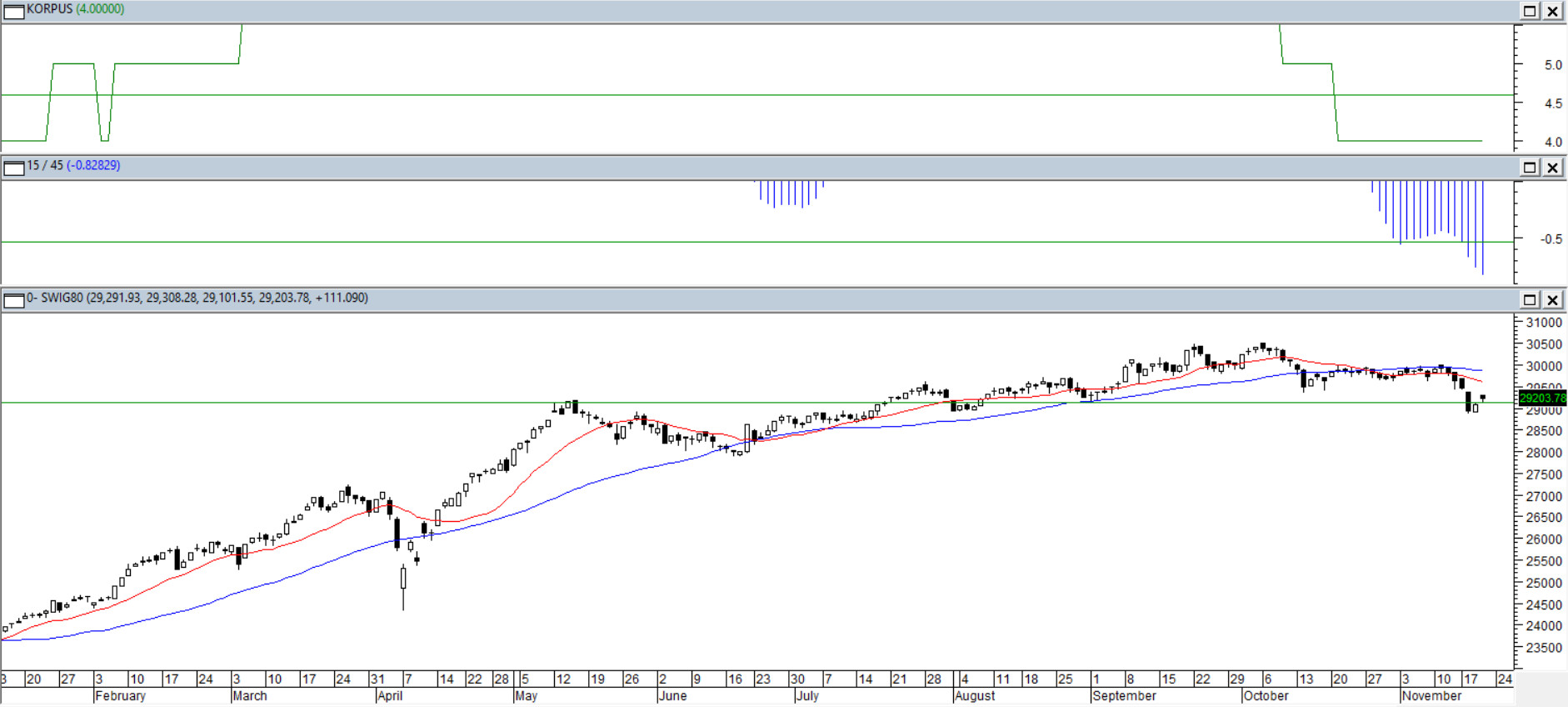 Indeks małych spółek wybił w dół październikowe wsparcie i utrzymuje się poniżej średnich 15/45, które zaczęły wyraźnie skręcać ku dołowi. Odległość między nimi stale rośnie i zbliża się do pułapu 1%, co oznacza największe rozwarcie w tym roku — sygnał typowy dla przejścia z fazy bocznej w realną słabość. Jeżeli przyjąć, że miarą siły trendu byka jest liczba białych korpusów ponad 1% w ostatnim półroczu, to tu mamy ich ledwie cztery. Ta statystyka wygląda jak zapowiedź przyszłego rynku niedźwiedzia lub co najmniej dłuższej korekty. Jedno jest pewne — sytuacja powinna niepokoić trendowego byka.