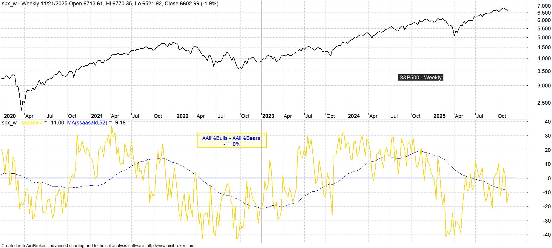 Ostatnie wyniki sondażu The American Association of Individual Investors pokazały wzrost odsetka byczych oczekiwań z 31.6% do 32.6% oraz spadek odsetka oczekiwań niedźwiedzich z 49.1% do 43.6%. W rezultacie saldo byków i niedźwiedzi (AAII%Bulls – AAII%Bears) utrzymało się w strefie wartości ujemnych (zmiana z -17.5% do -11.0%), pozostając w zgodzie z zarysowanym od kwietnia, czyli od początku obecnej fali hossy obrazem, w którym dodatnie odczyty salda zdarzają się tylko sporadycznie. Co więcej, poza tym, iż roczna średnia krocząca salda niezmiennie znajduje się w strefie wartości ujemnych, to nadal opada. Tymczasem dopóki wspomniana średnia nie ulokuje się na dłużej na plusie, z kontrariańskiego punktu widzenia nie będzie przesłanek do zakończenia obecnej hossy. Na krótką metę natomiast, trwającemu od końca października schłodzeniu cen akcji należałoby przypisywać typowo korekcyjny charakter.