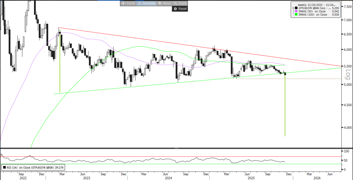 AT tygodniowy: Wybijanie się dołem z trójkąta w umiarkowanym scenariuszu oznacza retest wsparcia na 5,15-5,00%, a w przypadku powodzenia ruch o zakres podstawy trójkąta, czyli do poziomów 4,00-3,80%
