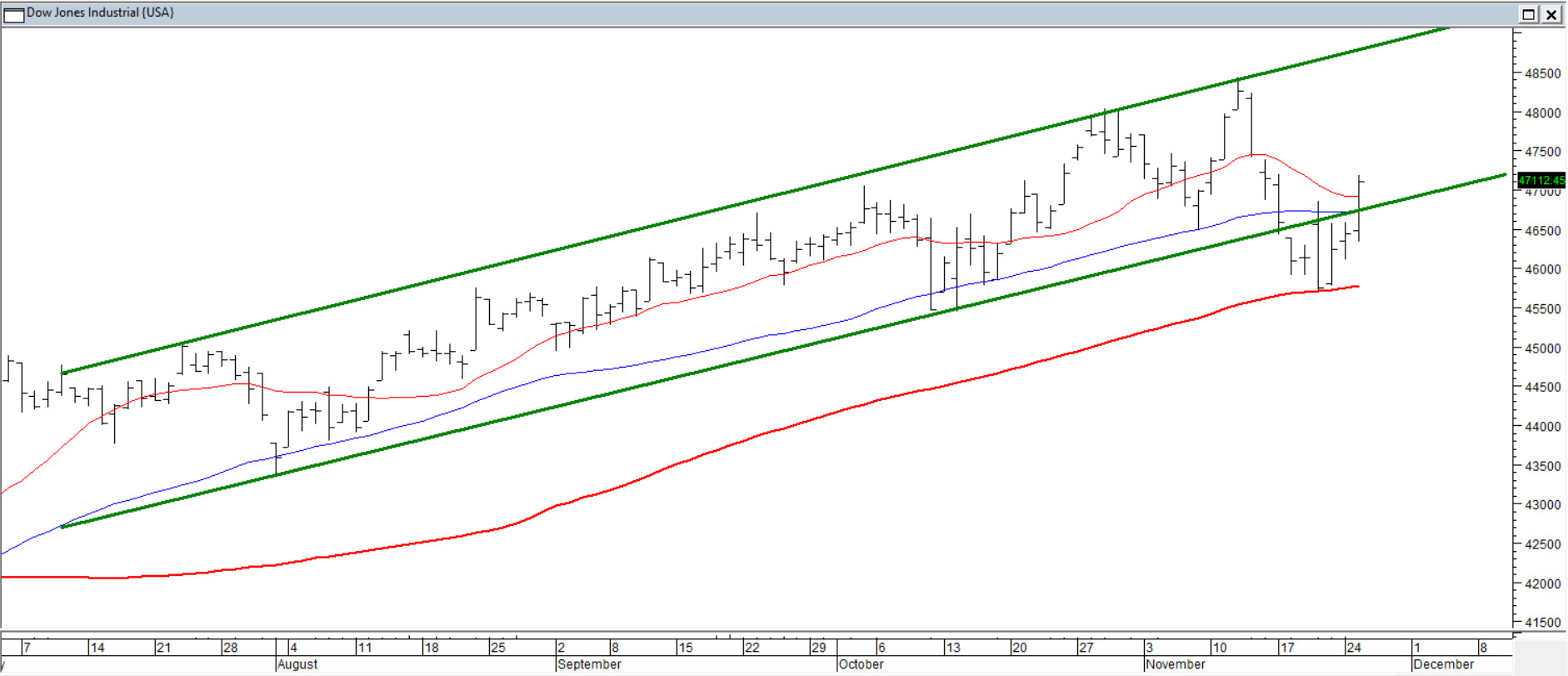 Niegdyś najpopularniejszy indeks świata w wakacje wszedł w klarowny kanał wzrostowy. Listopadowe zejście poniżej jego dolnego ograniczenia wyglądało jak zapowiedź większej korekty, ale siła rażenia niedźwiedzi była zbyt mała. Kurs szybko wrócił do kanału, zatrzymując się przy tym na średniej ze 100 sesji, co przywraca strukturę trendową. Ostatnie minimum nabiera przez to kluczowego znaczenia jako punkt odniesienia dla dalszego ruchu. Wtorkowe wybicie ponad średnie 15/45 daje pierwsze potwierdzenie odbudowy, a ADX(14) spadający w okolice 15 pkt sugeruje zbliżający się moment ponownego utrendowienia.