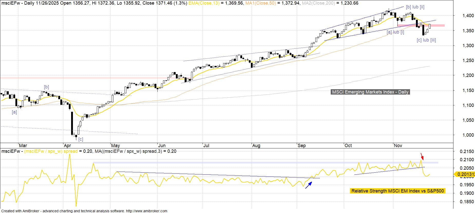 Miniony tydzień przyniósł na rynkach wschodzących wybicie dołem z formacji szczytowej w postaci 2-miesięcznego rozszerzającego się klina, sygnalizując możliwość większego ruchu korekcyjnego w fali wzrostowej trwającej od kwietnia. Mimo, iż wraz z odreagowaniem z ostatnich dni, podobnie jak w przypadku S&P500, pojawiła się tu możliwość zamknięcia korekty w relatywnie łagodnej postaci zygzaka [a][b][c], to o środowisku sprzyjającym ponowieniu spadków nadal można mówić w obszarze siły relatywnej. Traktując relację MSCI Emerging Markets Index vs S&P500, jako jedną z miar globalnego apetytu na ryzyko, w ostatnim czasie mieliśmy tu do czynienia z ostrzegawczym zatrzymaniem wzrostu na pułapie kwietniowego szczytu, po czym w minionym tygodniu doszło do zdecydowanego zwrotu w dół.