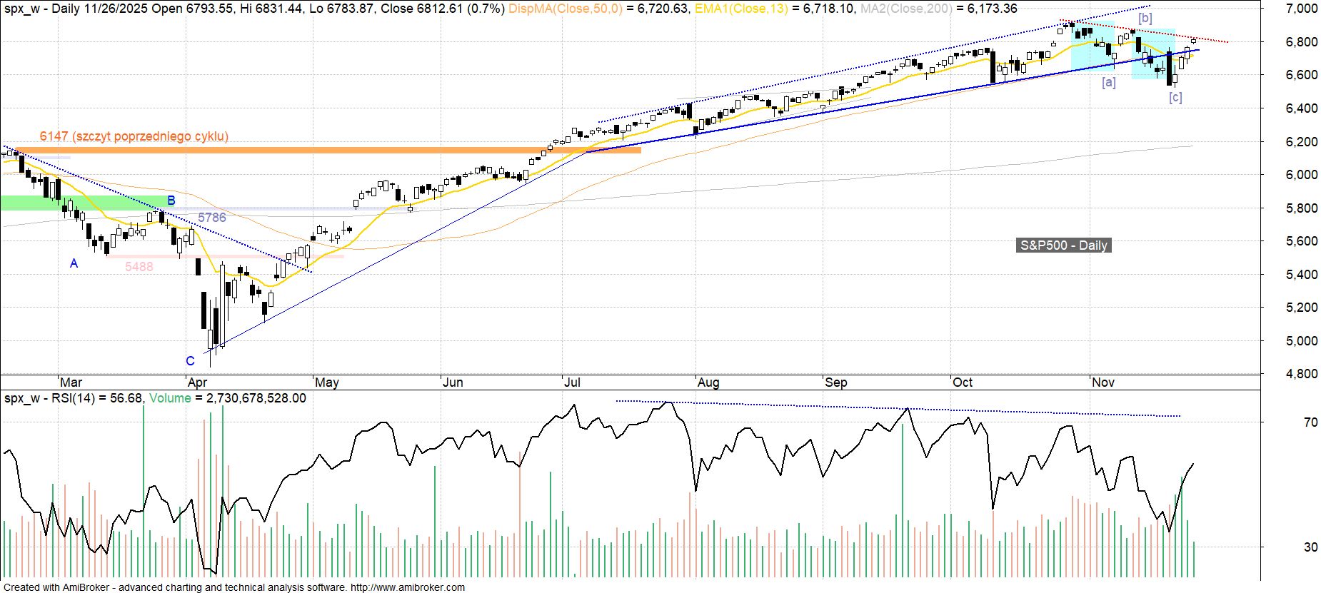 W kontekście oczekiwań pierwszej większej korekty w rozpoczętej w kwietniu wzrostowej fazie nowego cyklu nie można wykluczyć, iż tego typu korekta została już rozpoczęta szczytem z 29 października. Aby jednak wypełnić kryteria ‘większej’, dotychczasowa jej struktura (klasyczny zygzak z minimalnie dłuższą falą [c]) musiałaby zostać rozbudowana. Początkowo na preferencję takiego scenariusza pozwalał długi czarny korpus z ubiegłego czwartku, jednak po jego neutralizacji i wraz z trwającą właśnie próbą powrotu ponad wyłamaną wcześniej spowolnioną linię trendu wzrostowego, kwestia większej korekty jest ponownie otwarta. W grę wchodzi zarówno ponowienie zwrotu w dół (linia korekty nie została jeszcze przełamana) i realizacja większości scenariusza korekcyjnego jeszcze w 4Q’25 (analogie związane z sentymentem), jak i przesunięcie go dopiero na 1Q’26 (początek słabszego okresu w cyklu prezydenckim).