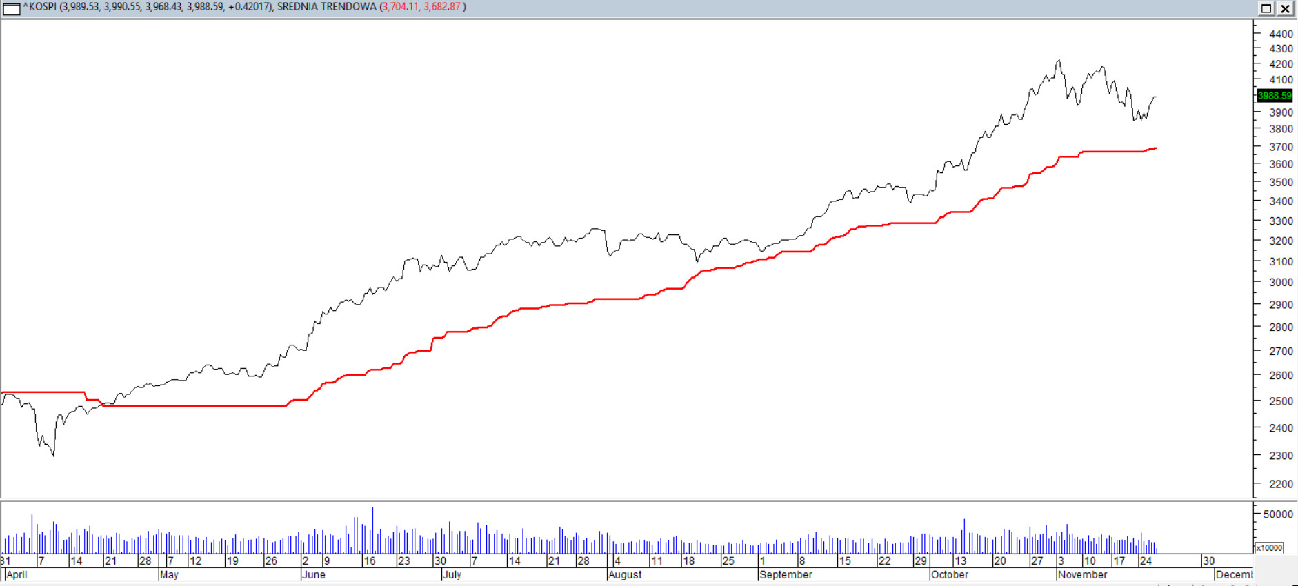 Na interwale 4h widać wyjątkowo czysty, podręcznikowy trend wzrostowy. Korekty w jego trakcie są płytkie w cenie i krótkie w czasie. Do utrzymania obecnego ruchu wystarcza średnia trendowa – hybryda średniej średnioterminowej i linii trzymającej stały dystans od bieżących ekstremów. Od kwietnia nie została ani razu istotnie przełamana, stanowiąc faktyczny kręgosłup całego ruchu na najpopularniejszym indeksie Korei Południowej. Listopad przyniósł najgłębszą korektę w tym cyklu, ale w skali ostatnich lat nadal jest to ruch z kategorii płytkich. Bieżąca korekta nie narusza struktury. Wykres obfituje w wyższe szczyty, a dołki zaś są wybijane jedynie płytko i okazjonalnie.