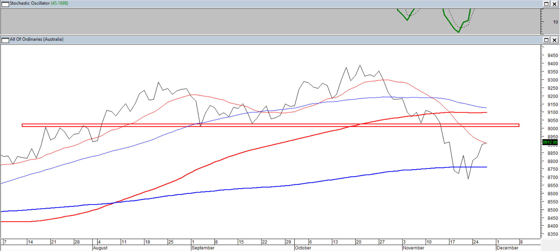 Najważniejszy indeks Australii, wyhamował spadek tuż przy średniej 200-sesyjnej. Odbicie, które się pojawiło, ma na razie bardziej cechy ruchu powrotnego w stronę przełamanych w listopadzie poziomów, a nie sygnału zmiany tendencji. Niemniej warto obserwować rynek przy podejściu pod 9000 pkt., bo tam wypada pierwszy realny test jakości odbicia. Średnie 15/45/100 pozostają powyżej notowań i tworzą układ oporowy. Pamiętajmy, że ostatni dołek wypadł przy wyraźnym wyprzedaniu oscylatorów, co sugeruje, że obecna zwyżka wynika w pierwszej kolejności z reakcji po wyczerpywaniu krótkoterminowej podaży.