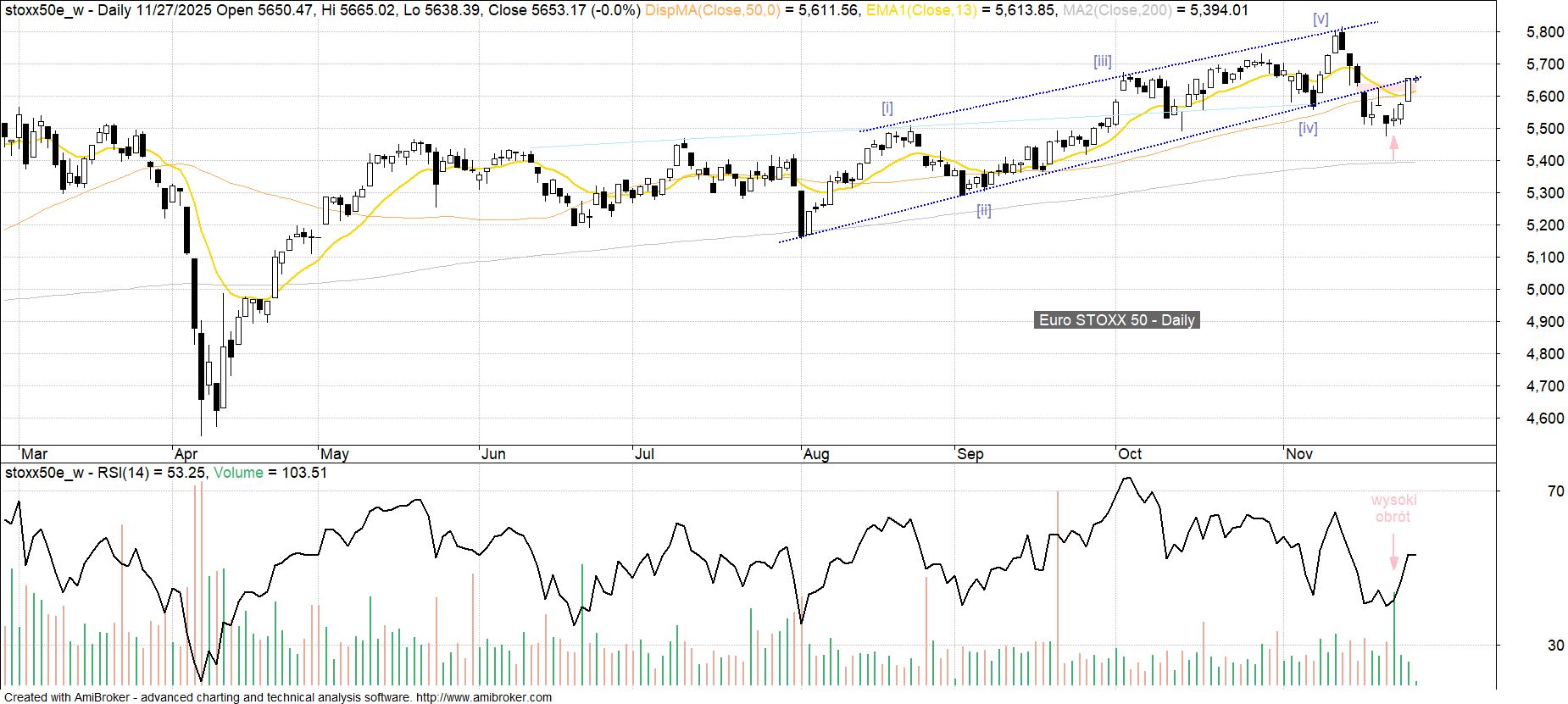 Indeks 50-ciu blue-chipów strefy euro zamykając lukę bessy z ubiegłego czwartku próbuje powrócić ponad dolne ograniczenie opuszczonego wcześniej ponad 3-miesięcznego wznoszącego się klina (a przy okazji także ponad 50-sesyjną średnią kroczącą). Choć do anulowania wybicia dołem brakuje bardzo niewiele, to problemem pozostaje 5-falowa struktura klina, po której zasadniczo należałoby oczekiwać adekwatnej czasowo 3-falowej korekty, czyli czegoś zdecydowanie bardziej okazałego niż dotychczasowy prosty ruch spadkowy z drugiej dekady listopada.