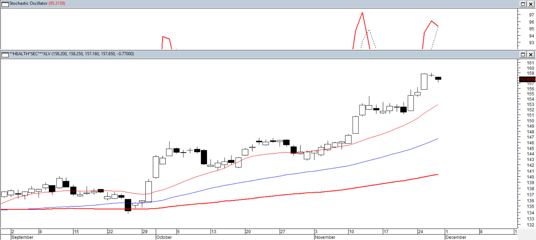 Najpopularniejszy ETF na amerykański sektor Healthcare ma się dobrze. Średnie 15/45/100 ułożone typowo dla silnego trendu wzrostowego. Oscylatory szybkie są mocno wykupione i sygnalizują nieuchronną korektę, ale to tylko efekt mocnego ciągu w górę; sam trend pozostaje niezagrożony. Sektor robi swoje: stabilnie, defensywnie i z konsekwencją, której innym sektorom ostatnio, ale jednak brakuje. Chciałoby się powiedzieć : Ile cię trzeba cenić, ten się dowie, kto cię …kupił.