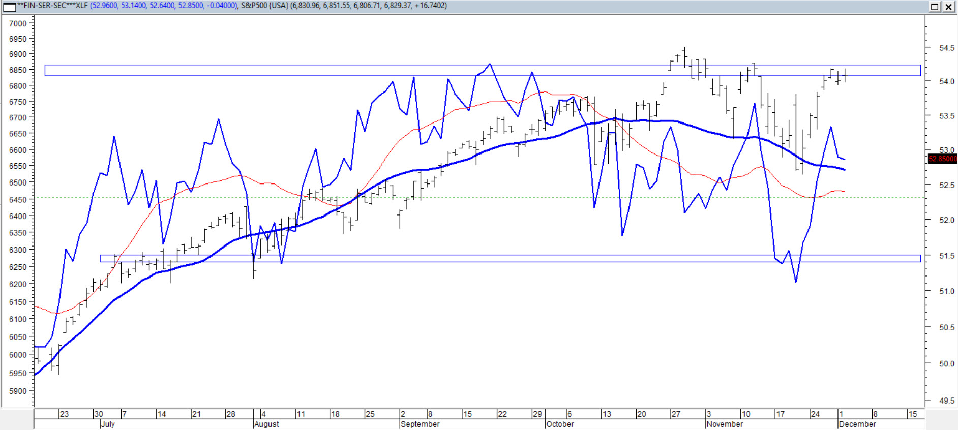 XLF, najpopularniejszy ETF na sektor finansowy w USA, od wakacji utrzymuje wyraźną relatywną słabość wobec indeksu S&P500. Kurs wyszedł poza letnie minima 51,5, i choć powrócił ponad średnie 15/45, układ pozostaje typowo korekcyjny. Strefa 54.0–54.4 nadal zatrzymuje popyt i blokuje przejście do impulsu. W takim układzie sektor działa raczej jako hamulcowy, a rolę lidera w obecnej zwyżce pełni sektor Technology.