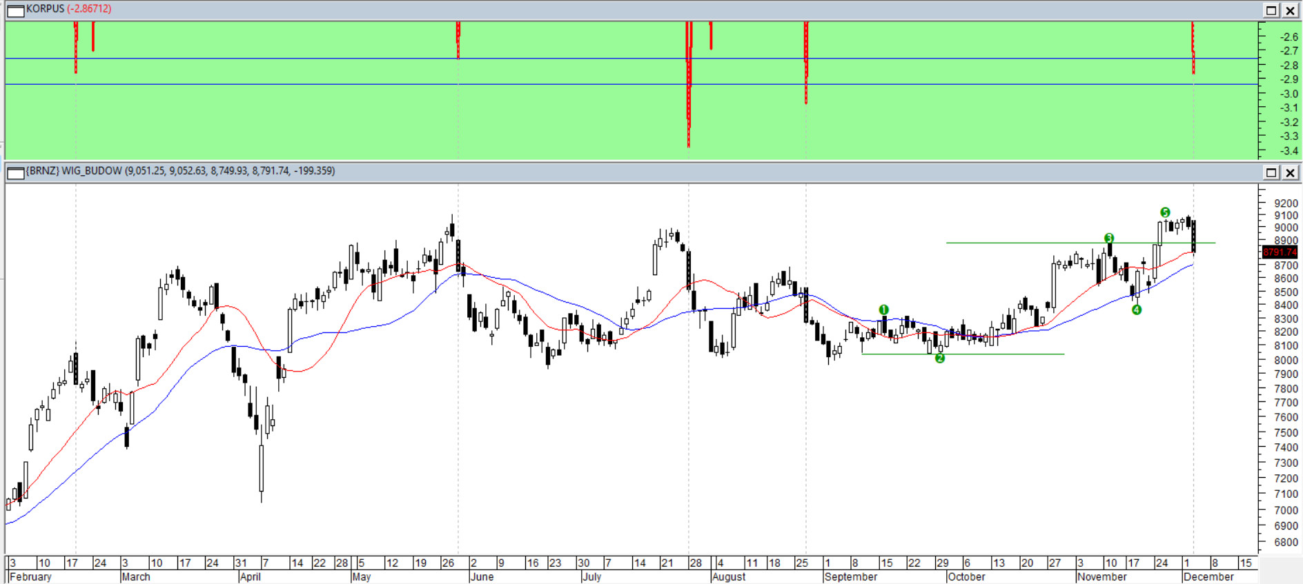 Duży czarny korpus na wysokim poziomie cenowym tradycyjnie sygnalizuje gotowość do zmiany tendencji na rynku — i ta teza na WIG-Budownictwo w 2025 roku jest wręcz książkowa. Za każdym razem, gdy pojawiał się korpus > 2,5%, pokłosie było jednoznaczne: rynek wchodził w korektę większego rzędu. Teraz mamy dokładnie ten sam wzorzec, uformowany zresztą po pięciofalowym marszu w górę, tak więc kontra podaży nie powinna dziwić i jest wpisana w modelowy scenariusz. Średnie 15/45 nadal rosną, co utrzymuje trend. Kluczem pozostaje obrona rejonu 8650–8700 pkt.