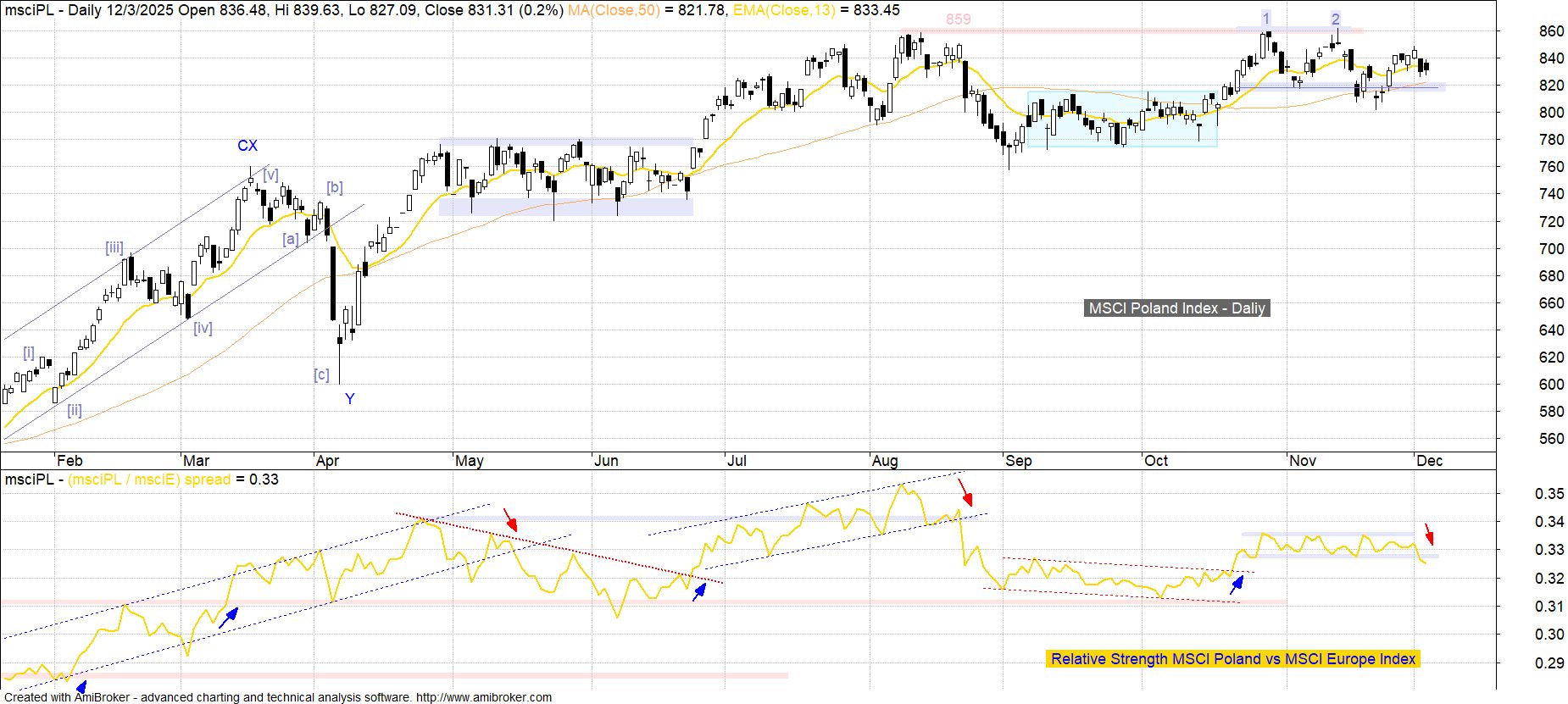 Choć w przypadku kluczowego z punktu widzenia inwestorów zagranicznych indeksu MSCI Poland, inaczej niż dla WIG, czy WIG20, nie ma na razie mowy o zagrożeniu ponowną aktywacją formacji podwójnego szczytu z przełomu października i listopada (linia sygnalna 817 pkt), to ostatnie dwie słabsze sesje przynoszą niepokojące sygnały w obszarze siły relatywnej. W szczególności wskaźnik Relative Strength MSCI Poland vs MSCI Europe Index opuścił dołem wąską konsolidację w jakiej pozostawał od końca października. W dłuższej perspektywie natomiast oddaliły się szanse na odrobienie zaległości wobec rynków bazowych jakie narosły od czasu sierpniowego szczytu, co jednocześnie podkreśla jego oporową wymowę.
