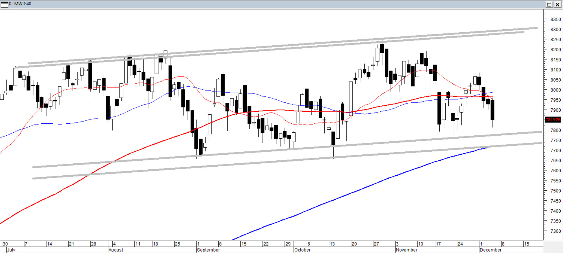 Średniaki wchodzą w grudzień w wyraźnej słabości. Dwa mocne czarne korpusy zepchnęły indeks poniżej 8000 pkt. Średnie 15/45/100 tworzą obecnie gęsty splot, a po czwartkowej sesji kurs znalazł się pod nim — to sygnał mogący zainicjować dalszą przewagę podaży. Kurs porusza się od wakacji w lekko nachylonym ku górze kanale wzrostowym. Z tej perspektywy nic złego na rynku się nie dzieje — cały układ wciąż mieści się w obowiązującej strukturze. Niemniej jednak grudzień, statystycznie dobry czas dla byków, na razie nie przynosi oczekiwanego efektu. Na tym tle powrót ponad maksimum z poniedziałku wydaje się dla popytu wręcz niezbędny.