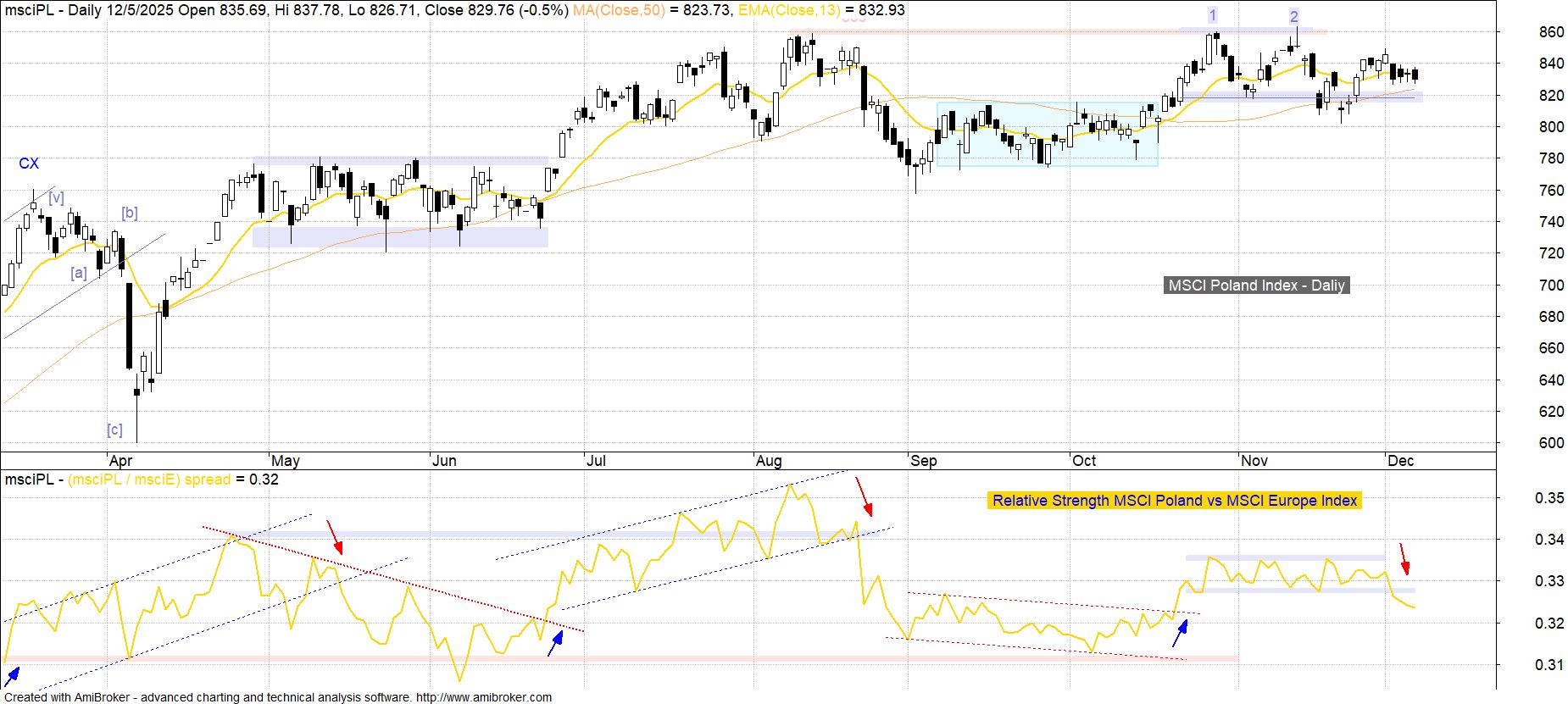 Kluczowy z punktu widzenia inwestorów zagranicznych indeks MSCI Poland w minionym tygodniu stracił 1.4%, co nominalnie nie jest może zmianą szczególnie znaczącą, ale mocno wyróżniającą się na niekorzyść na tle zarówno MSCI Europe Index (tygodniowa zmiana +0.7%), jak i MSCI Emerging Markets Index (+1.4%). W rezultacie wskaźnik Relative Strength MSCI Poland vs MSCI Europe Index opuścił dołem wąską konsolidację w jakiej pozostawał od końca października, co w dłuższej perspektywie oddala możliwość odrobienia zaległości wobec rynków bazowych jakie narosły od czasu sierpniowego szczytu, jednocześnie podkreślając jego oporową wymowę.