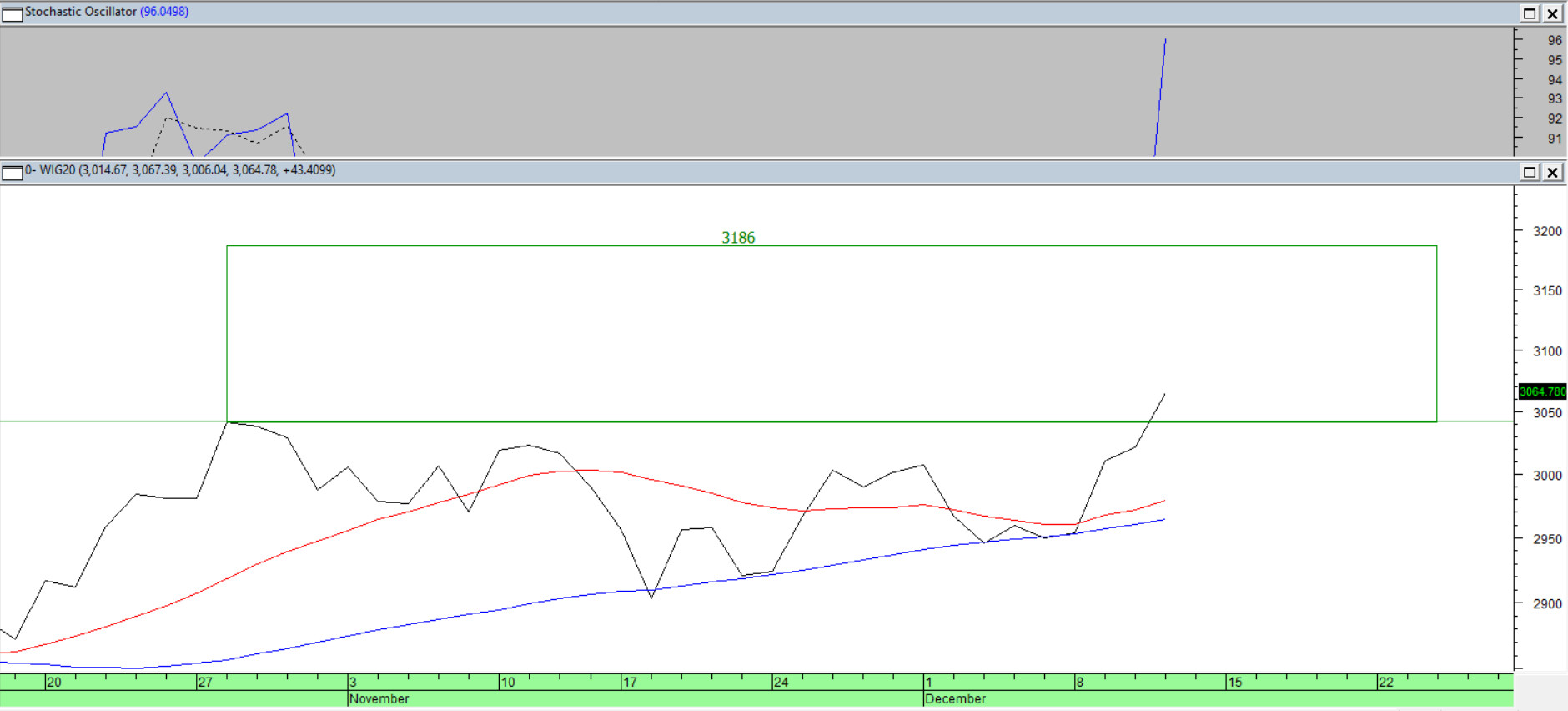 Na wykresie indeksu sWIG80 spadek z pierwszej połowy listopada wyprowadził kurs poniżej średnich 45 i 100, co zakończyło wcześniejszą fazę boczną i otworzyło uczestników rynku na nieco dłuższą niż do tej pory przecenę. Siła relatywna względem pozostałych krajowych indeksów wyraźnie się obniżyła.