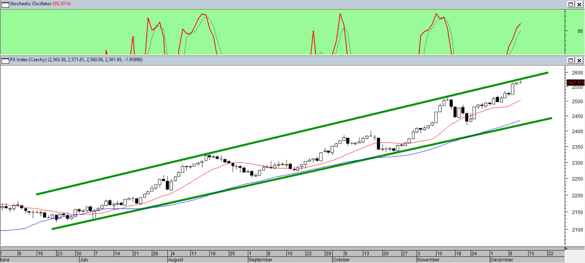 Podczas czwartkowej sesji najważniejszy czeski indeks zwyżkował o blisko 1,5%, a kurs znalazł się na najwyższym poziomie w historii. W krótszej perspektywie czasowej rynek zbliżył się do górnego ograniczenia kanału wzrostowego, który prowadzi notowania od czerwca. Świece z ostatnich sesji pokazują wyraźne przyspieszenie, ale nadal bez wybicia ponad linię ograniczającą strukturę.
