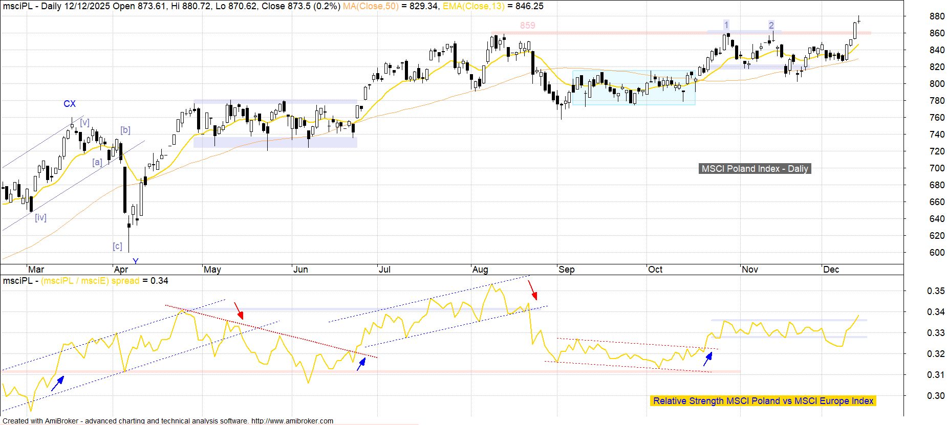 Kluczowy z punktu widzenia inwestorów zagranicznych indeks MSCI Poland, po podejmowanych na przełomie października i listopada dwóch nieudanych próbach wyjścia ponad sierpniowy szczyt 859 pkt, w końcu dokonał tego na ostatnich sesjach minionego tygodnia. Ostrzeżeniem co do możliwości ruchu powrotnego jest przebieg sesji piątkowej, gdzie na koniec dnia zbudowana została niedźwiedzia świecowa formacja spadającej gwiazdy. Jej rozmiary są wprawdzie stosunkowo niewielkie, jednak elementy świecowe o podobnej wymowie pojawiły się także na rynkach bazowych (przykładowo zasłona ciemnej chmury w przypadku indeksu MSCI Europe).