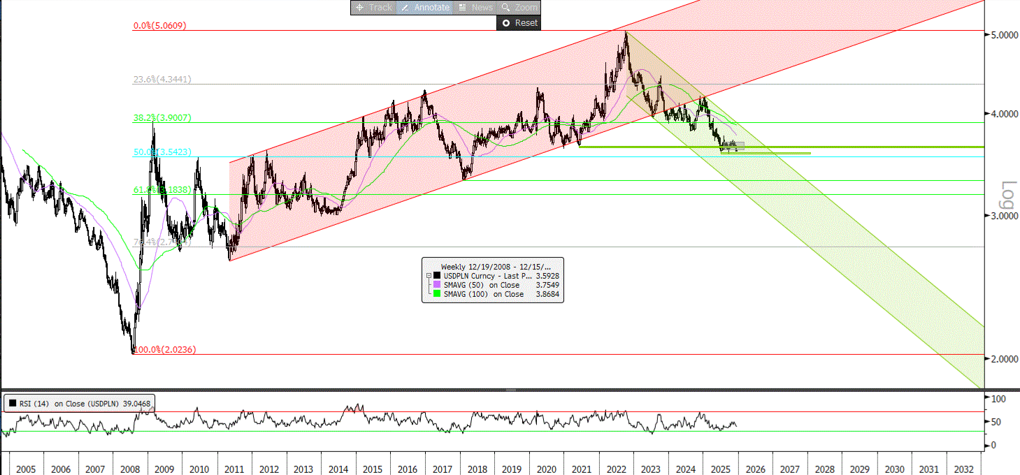 AT tygodniowy: notowania testują kluczowe wsparcia na 3,60-3,57, którego pokonanie otworzy drogę do testu 3,53 (50% zniesienia osłabienia od 2008 r.) i przybliży cel w postaci dołka z 2018 r. na 3,32.