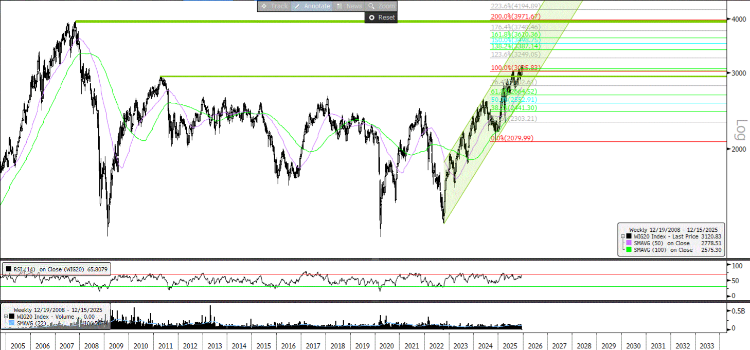 AT tygodniowy: w średnim terminie celem WIG20 jest 3249 pkt. (123,6% ruchu między kwietniem a sierpniem br.), przy czym mając na uwadze wyjście ponad szczyt z 2011 r. (2942 pkt.) i w przypadku wsparcia fundamentalnego (rewizja w górę dynamiki PKB Polski i wzrost oczekiwanych wyników spółek, czy zakończenia wojny w Ukrainie) otwiera się przestrzeń do dużo większej zwyżki – nawet w okolica ATH (3940 pkt.)