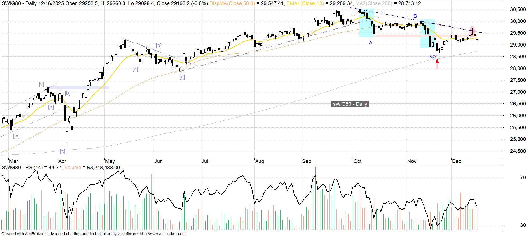 Tendencja spadkowa, jaka na rynku małych spółek pojawiła się po tegorocznym szczycie 30.5 tys. pkt z 6 października aktualnie przyjmuje postać typowej korekty ABC z nieznacznie tylko przekroczoną równością fali C względem fali A. W tym układzie pierwszym wskazaniem przemawiającym za zakończeniem korekty byłoby wyjście powyżej lokalnego dołka 29.4 tys. pkt z 14 października (dno domniemanej fali A), czego pierwsza próba miała miejsce końcem minionego tygodnia. Próba ta okazała się mocno nieudana, gdyż poza potwierdzeniem oporu w rejonie nadal obowiązującej opadającej linii korekty, jej efektem jest także sygnał lokalnego zwrotu w dół w postaci relatywnie sporych rozmiarów świecowej formacji spadającej gwiazdy.