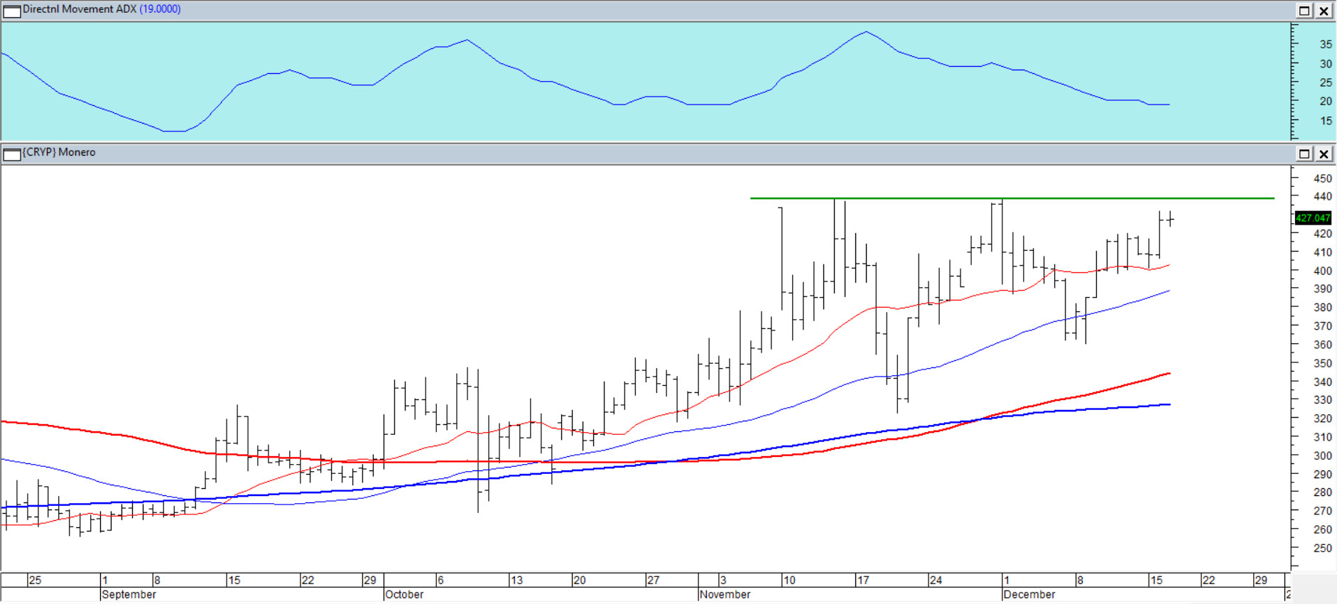 XMR to dziś jeden z nielicznych krypto-walorów, który trzyma się ponad sekwencją średnich 15/45/100/200. Rynek znów podchodzi pod listopadowy opór 438,00, tak więc „przymiarki” do wybicia oporu są jak najbardziej realne. Listopadowa konsolidacja układa się w trójkąt zwyżkujący z tą barierą, więc wyjście ponad 438 będzie czytelnym sygnałem kontynuacji. Jedyne, co zgrzyta, to tło rynku: szerzej w strefie krypto wciąż dominuje słabość, a większości projektów bliżej do dołków niż do testów szczytów — to jak wiemy potrafi dusić nawet liderów.