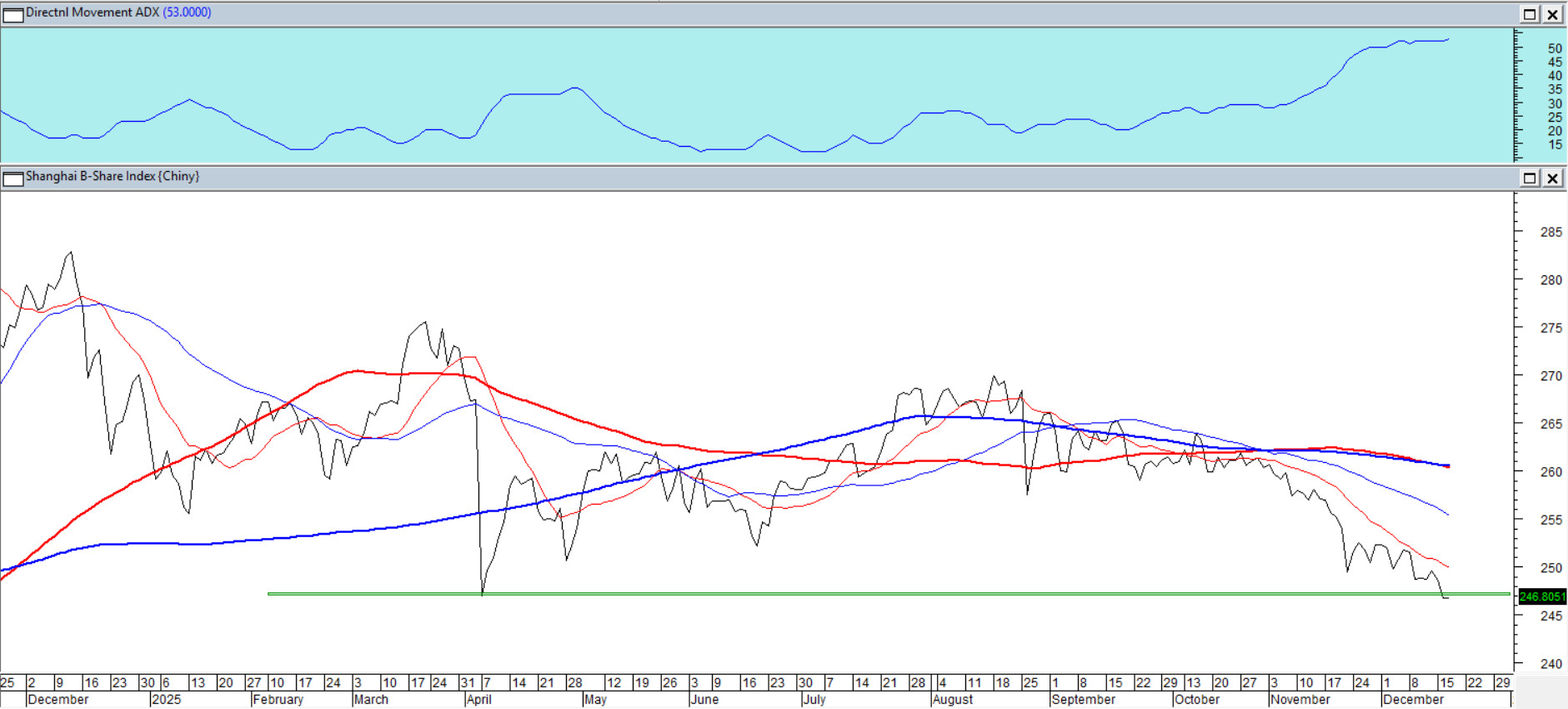 Inwestor rozliczający Chiny w dolarze nie zaliczy tego roku do udanych. Shanghai B-Share Index (segment notowany w USD) w ostatnich dniach wyznacza nowe tegoroczne minima, schodząc poniżej 247,0 pkt. ADX(14) na poziomie ok. 52 pkt. potwierdza mocno rozwinięty trend spadkowy, ale jednocześnie sugeruje, że rośnie ryzyko korekty obecnego ruchu — ten trend jest już po prostu trochę „za silny”. Ten obraz wzmacnia układ średnich 15/45/100/200, typowy dla dojrzałego trendu spadkowego. Kluczowe wsparcie wypada w strefie 246–247: utrzymanie tego rejonu to jedyna szansa na krótkie uspokojenie, natomiast zejście poniżej może tradycyjnie otworzyć przestrzeń do kolejnego etapu wyprzedaży.