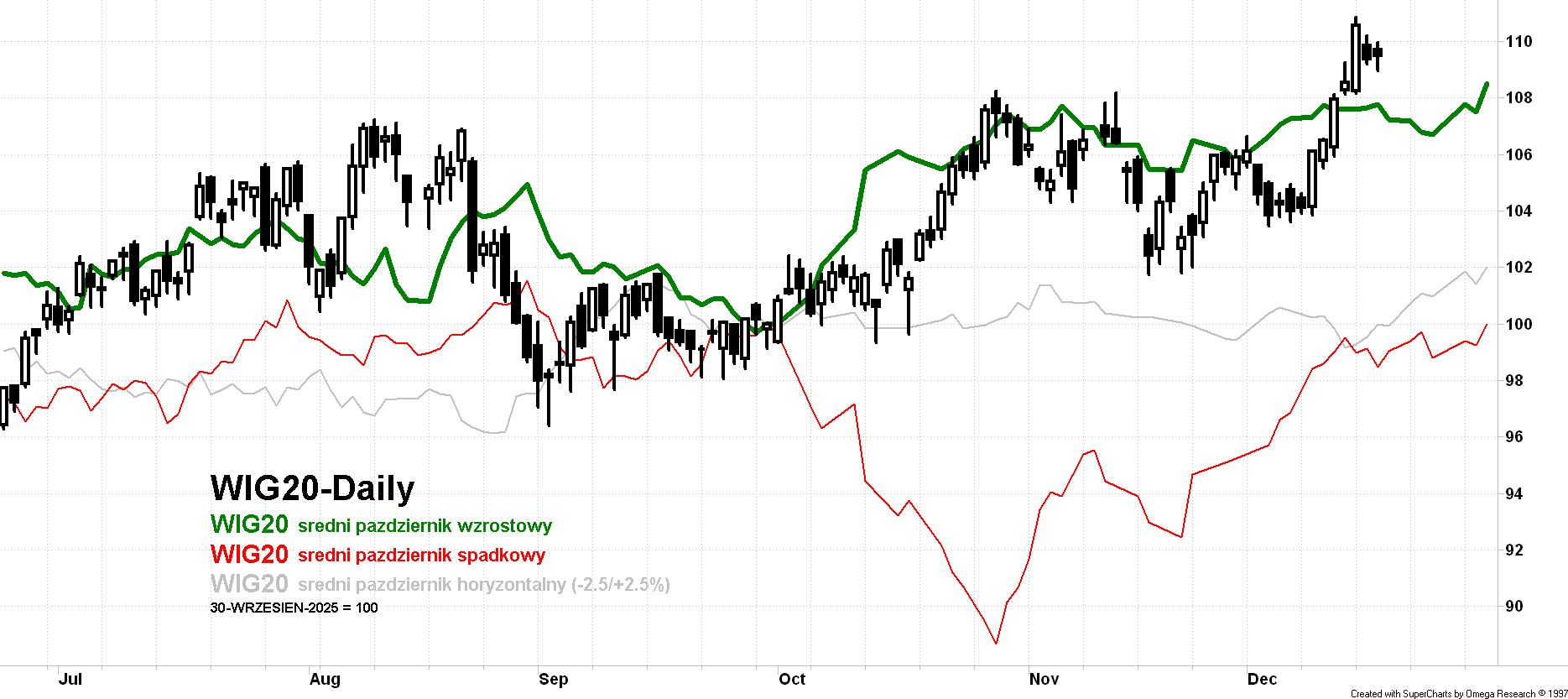 Natomiast w kwestii szacunku kształtu koniunktury do końca IV kwartału można wykorzystać podobieństwo do wykresów sezonowych pogrupowanych wg kryterium wzrostowego, spadkowego, bądź horyzontalnego października (odpowiednio linie zielona, czerwona i szara). Pokazują one dość wyraźnie, iż w tej perspektywie następstwem wzrostowego października jest najczęściej tendencja zbliżona do horyzontalnej, natomiast bardziej zdecydowana zwyżka w okresie listopad-grudzień (co byłoby zgodne z szeroko opisywanym "Efektem Halloween") pojawia się zasadniczo w zupełnie odmiennej sytuacji, czyli wówczas gdy październik zamykał się wyraźnie ujemnym bilansem. Odnosząc zaś to wszystko do obecnej sytuacji, o ile w listopadzie tendencja do pozostania horyzoncie sprzyjała szybkiemu odrobieniu strat z początkowej części miesiąca, to po niedawnym wyraźnym wyjściu WIG20 ponad szczyty z przełomu października i listopada (3 060 / 3 066 pkt) odchylił się on także w górę od średniej liczonej wg kryterium wzrostowego pierwszego miesiąca kwartału. W tym przypadku więc zależności sezonowe do końca grudnia nie będą sprzyjały kontynuacji zwyżek.
