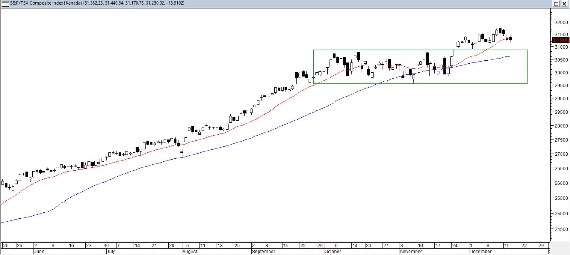 To jakże popularne sformułowanie wśród inwestorów. Bez wątpienia może dotyczyć głównego indeksu giełdy w Toronto i benchmarku szerokiego rynku kanadyjskich akcji. Od kwietniowego dołka – czyli przez 8 miesięcy – indeks nie skorygował głębiej niż 3%, co należy uznać za sekwencję nietuzinkową; od dołka z 2009 roku podobny układ zdarzył się raptem 6 razy. I oczywiście w konsekwencji doprowadził za jakiś czas do korekty większego niż 3% rzędu. Problemem jest pytanie o jej głębokość. Z pewnością „prostokąt” pozostawiony przez rynek jesienią, strefa 29 539–30 875, powinien chronić byki. Układ średnich 15/45 bezsprzecznie pozostaje prowzrostowy. "Trend jest twoim przyjacielem", ale pod warunkiem, że inwestor nie nabędzie na jego końcu.
