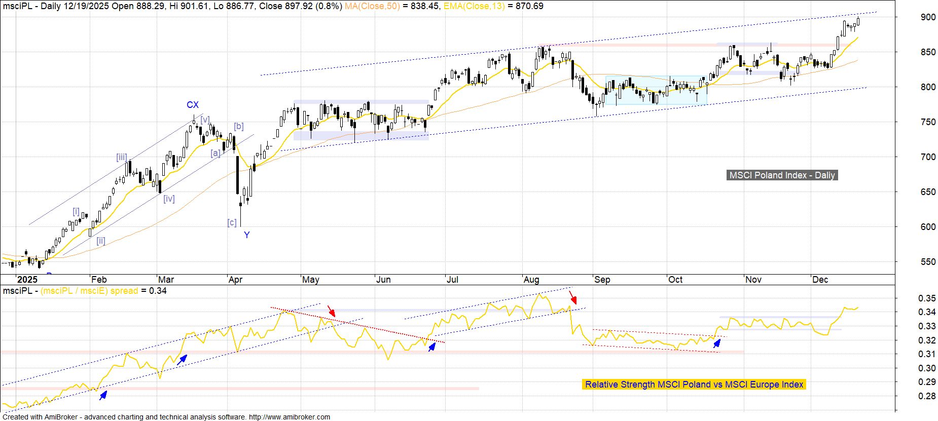 Kluczowy z punktu widzenia inwestorów zagranicznych indeks MSCI Poland wraz z wysoką białą dzienną świecą sprzed tygodnia wyraźnie przekroczył pułap szczytów z przełomu października i listopada (860 / 863 pkt), co zasadniczo jest zachowaniem oderwanym od nie podejmujących podobnych prób rynków bazowych. Obecnie stosunkowo najbliżej ma do tego część wskaźników ogólnoeuropejskich (w szczególności MSCI Europe Index) i wydaje się, iż bez analogicznego rozstrzygnięcia przynajmniej w tym segmencie, w przypadku rynku polskiego będzie należało liczyć się z nietrwałością wybicia. W obszarze siły relatywnej mamy do czynienia z korzystnym ponowieniem rozpoczętego w październiku odbicia wskaźnika MSCI Poland vs MSCI Europe Index, jednak w dłuższej perspektywie nadal nie można wykluczyć możliwości, iż jest to jedynie korekta słabości mającej miejsce po szczycie z pierwszej połowy sierpnia br.