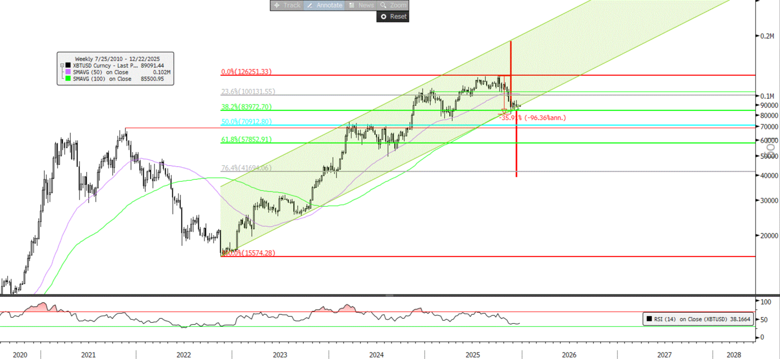 AT tygodniowy: notowania są na dolnym ograniczeniu kanału wzrostowego formowanego od końca 2022 r., którego trwałe przełamanie otwierałoby techniczny zakres spadku o wysokość kanału (~50 tys. wg skali logarytmicznej), przy czym niskie wartości RSI oraz zniesienie 38,2% wzrostu od 2022 r. nieco bardziej sprzyja stronie popytowej i próbie kontynuacji wzrostów w ramach kanału formowanego od 2022 r.