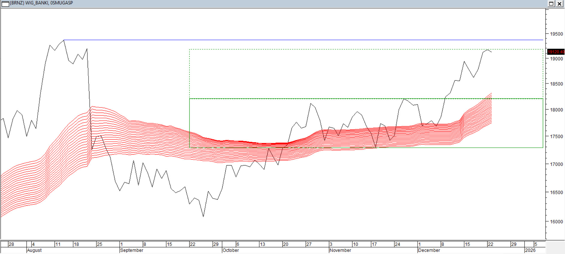 Najważniejszy polski instrument branżowy tuż przed świętami zrealizował minimalny zasięg wybicia z jesiennej konsolidacji. W ujęciu intra zostaje jeszcze niewielki margines ruchu, zasięg ten znajduje się tuż przy wakacyjnych maksimach. Nie oznacza to jednak, że trend się kończy, zwłaszcza że trudno dostrzec jakiekolwiek sygnały zmiany obecnej tendencji, choć jak wiadomo szybkie oscylatory w okolicach 90 pkt to małe ostrzeżenie dla poruszających się trendowo. Wiązka krótkoterminowych średnich jest nachylona w górę i nadal trzyma trend.