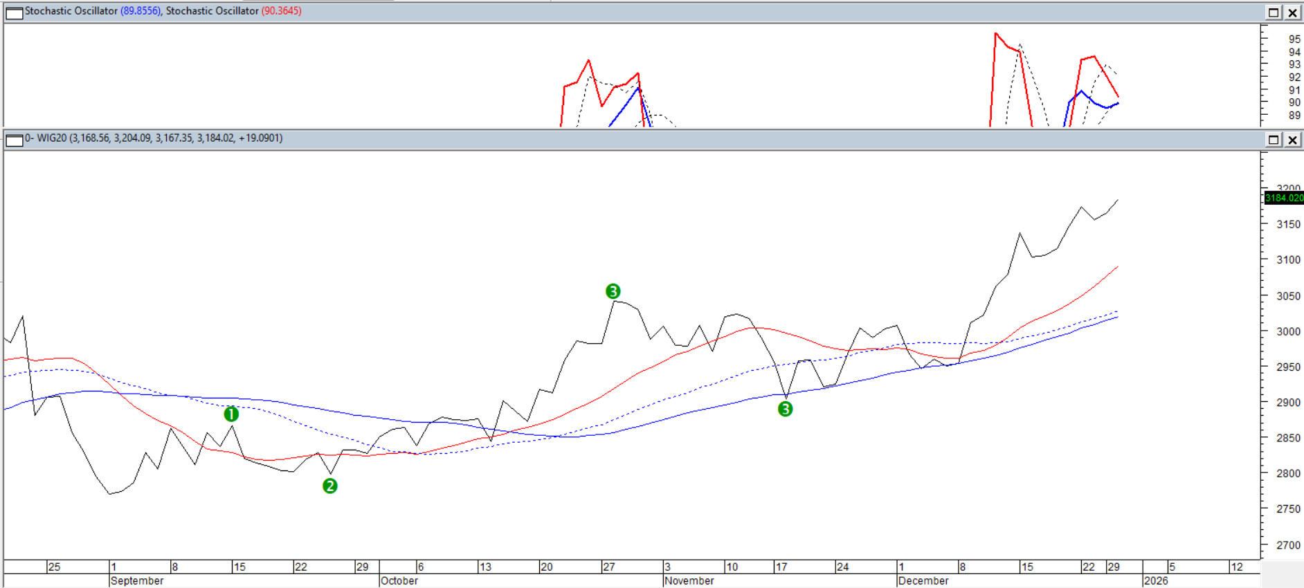 Minimalny zasięg pięciofalowej zwyżki, wyznaczony na 3115 pkt, został osiągnięty w połowie grudnia, a przed końcem roku rynek sięgnął kolejnego poziomu – 3191 pkt. Samo domknięcie zasięgów nie oznacza zwrotu, choć na tych poziomach trzeba już liczyć się z ryzykiem większej korekty. Co istotne, w sekwencji prowadzonej od listopadowego dołka nie widać jak dotąd klasycznej, małej „czwórki”, więc ten impuls wciąż nie wygląda na zakończony. Rynek może więc dalej „dociągać” ruch, ale wykupienie oscylatorów – szybkich i wolnych (~89/90)– zwyczajowo zapewne będzie przeszkodą dla bardziej żwawego ponoworocznego rajdu w górę.