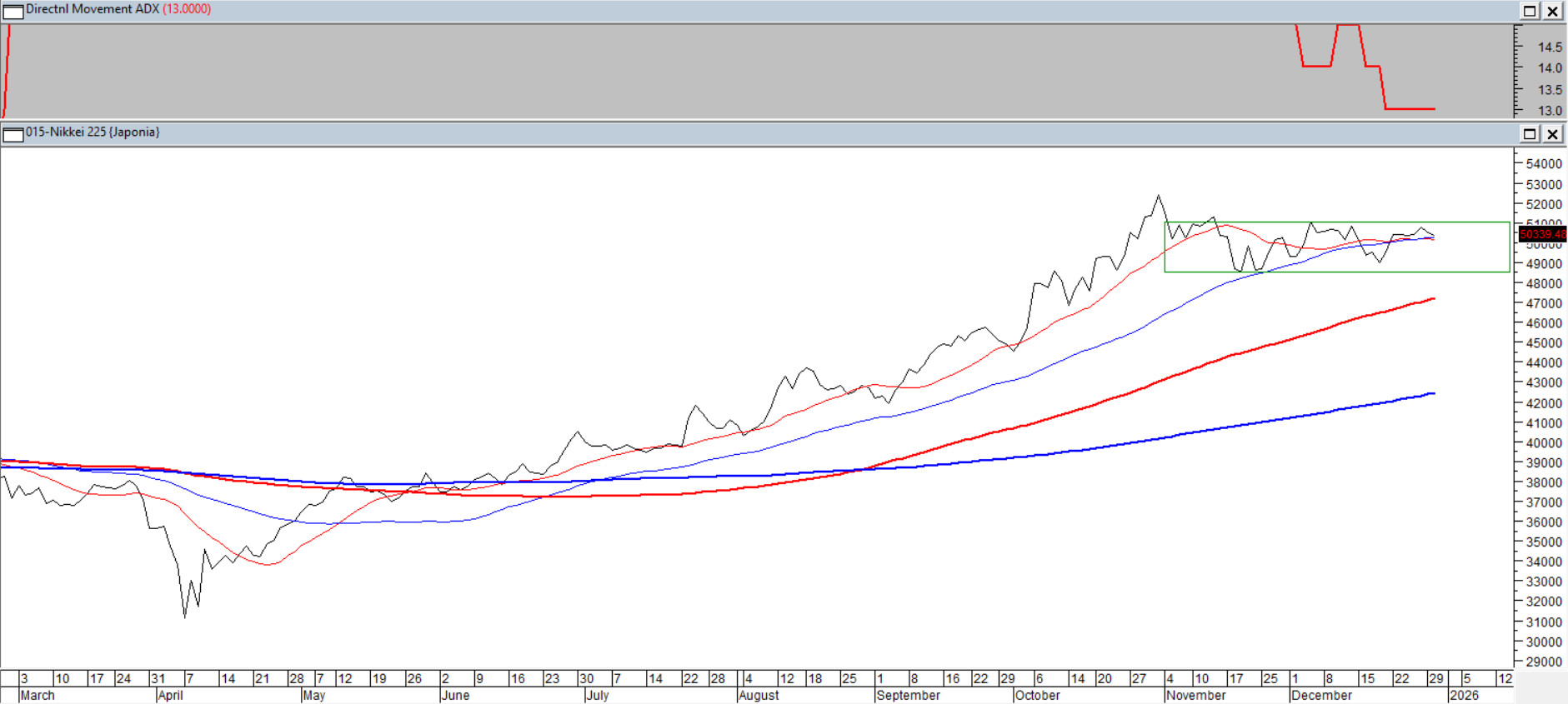 Główny indeks giełdy w Tokio po dynamicznym ruchu wzrostowym wszedł w kilkutygodniową konsolidację tuż pod lokalnymi szczytami. Zakres wahań pozostaje relatywnie wąski i przyjął postać klasycznego prostokąta. Średnie 15/45 "skleiły się”, co przybliża deklarację rynku i próbę dynamizowania. Podobnie zachowuje się ADX(14). Ten systematycznie opada, przygotowując się do nowego trendu. Struktura rynku pozostaje nienaruszona. To klasyczna konsolidacja w trendzie — wybicie górą zwyczajowo oznacza kontynuację, wybicie dołem dopiero postawi znak zapytania.