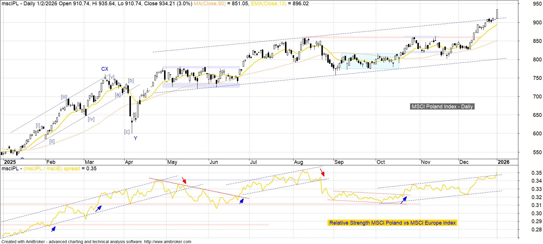 Kluczowy z punktu widzenia inwestorów zagranicznych indeks MSCI Poland po mocnej pierwszej sesji roku (+3.0%) wychodzi z ram zwyżki przebiegającej w poprzednich miesiącach w formie łagodnie nachylonego w górę kanału. W tym newralgicznym momencie dla utrzymania bezpiecznej byczej przewagi konieczna jest obrona ostatniego wysokiego białego korpusu (910 pkt). Od drugiej dekady grudnia mamy do czynienia z korzystnym ponowieniem rozpoczętego w październiku odbicia wskaźnika MSCI Poland vs MSCI Europe Index, a kolejną okazją do weryfikacji poprawiającej się siły relatywnej będzie zbliżający się test ubiegłorocznego szczytu z pierwszej połowy sierpnia.