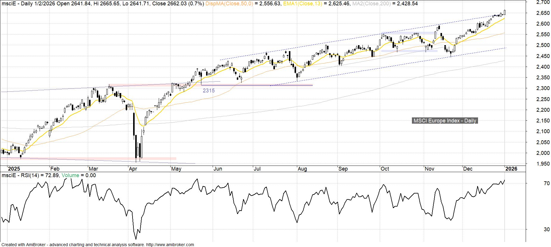 Skupiający 15 europejskich rynków rozwiniętych indeks MSCI Europe od czasu przekroczenia poprzedniego cyklicznego szczytu (maj ub.r.) porusza się w obrębie umiarkowanie nachylonego w górę kanału, przy czym na ostatnich sesjach podjęta została próba wybicia ponad jego górne ograniczenie (obecnie ok. 2 640 pkt). Zważywszy na to, iż w trwającej od kwietnia hossie do tej pory nie pojawiła się większa korekta, zagrożenie jej rozpoczęcia znacznie wzrosłoby w przypadku nieutrzymania wspomnianego wybicia.