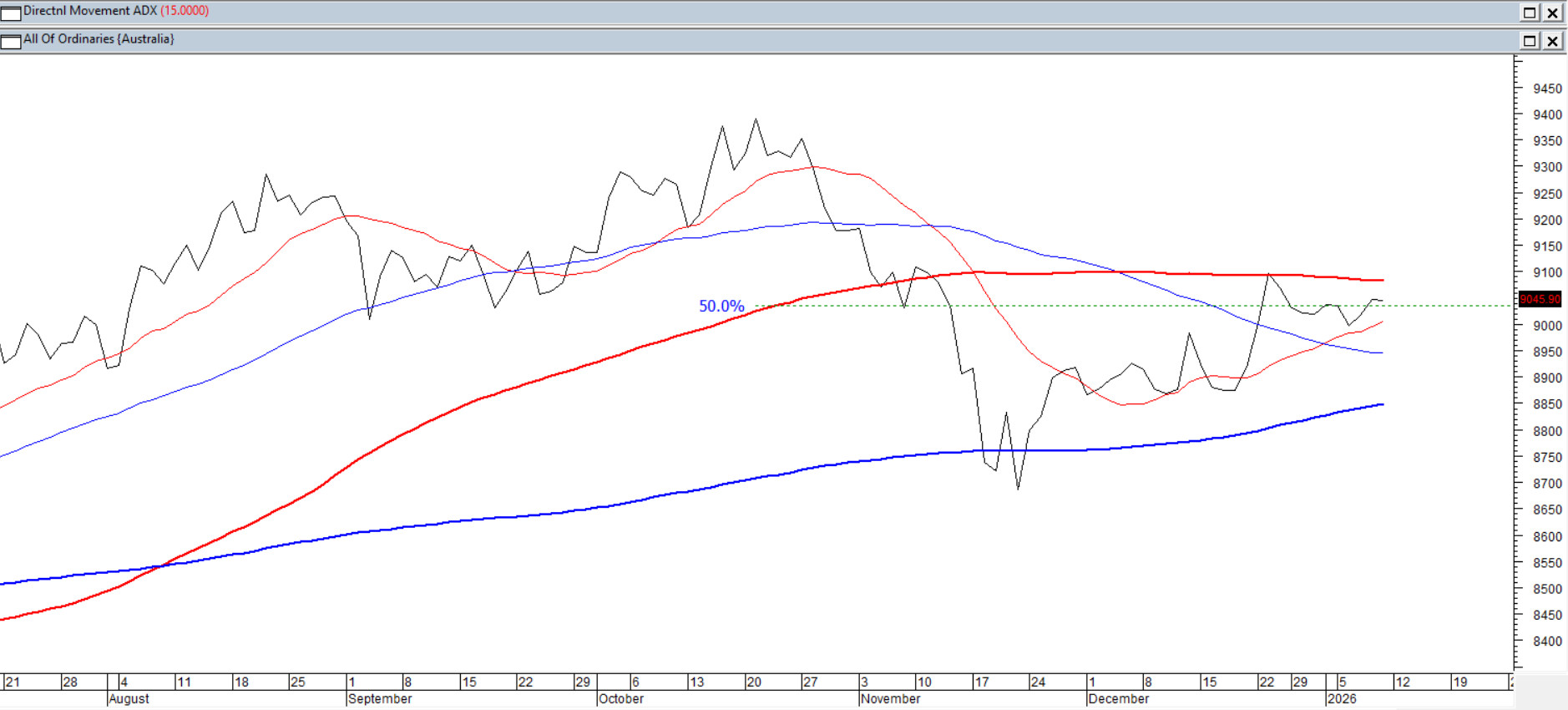 Najbardziej popularny australijski indeks giełdowy znajduje się w wyraźnym impasie. Kurs utknął w pobliżu połowy całego jesiennego spadku. ADX(14) uformowany na stosunkowo niskim poziomie potwierdza poszukiwanie trendu. Średnie 15/45/100/200 ścisnęły się do poziomu 2,6%, co oznacza w praktyce ułożenie do przyszłego bardziej wartkiego trendu. Stąd oczekiwanie na wzrosty nad sekwencją wspomnianych średnich, względnie na spadki pod – powinno być najbardziej efektywną strategią inwestycyjną.