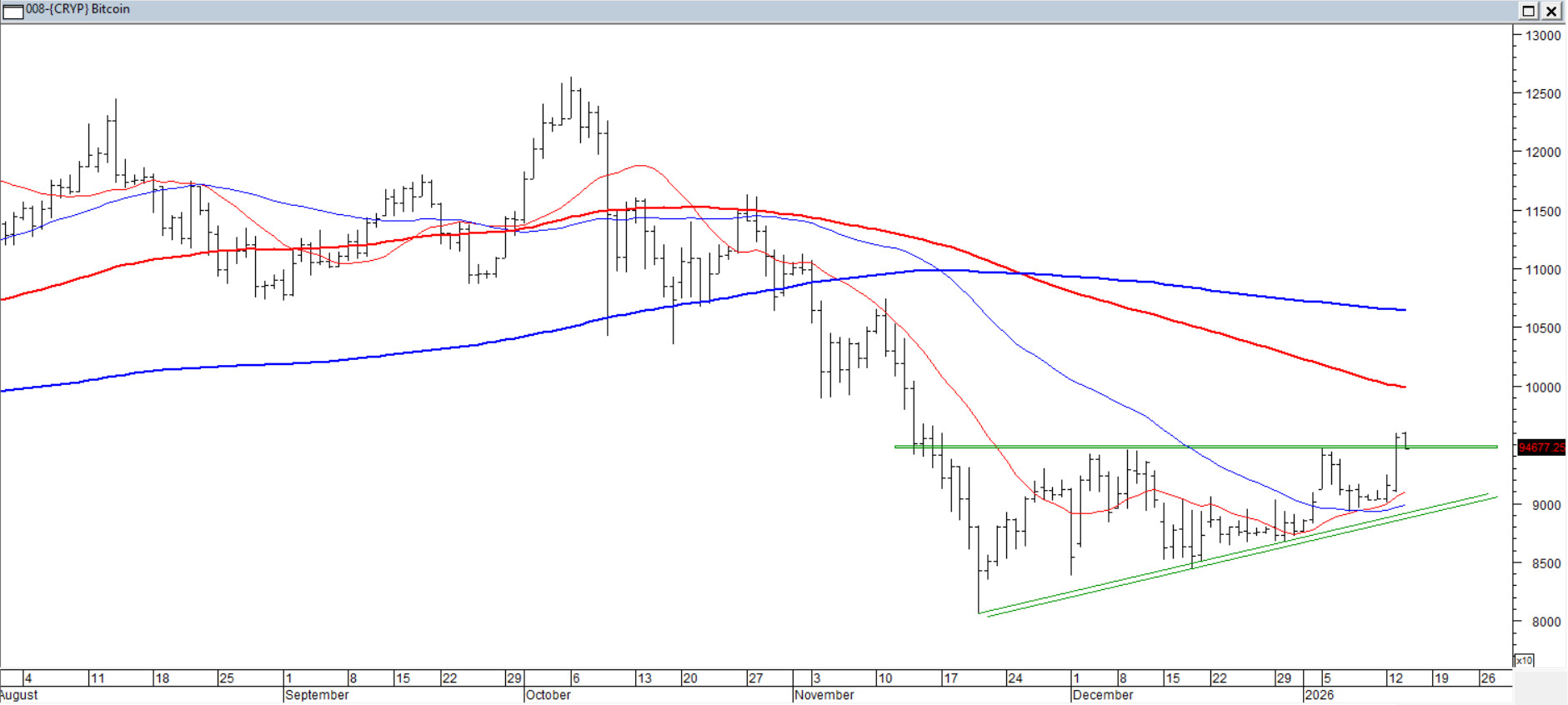 Podczas ostatnich sesji kurs najpopularniejszej kryptowaluty znalazł się powyżej oporu około 95000 USD, wyznaczonym przez formujący się trójkąt zwyżkujący. To rzadkość, gdy dochodzi do próby odwrócenia tendencji za pomocą takiej figury, niemniej wybicie oporu mogłoby przynieść bykom ożywczy ruch kontynuacyjny. Warto jednak pamiętać, że kurs nadal przebywa w klasycznym trendzie spadkowym, a obecna konsolidacja połączona z poprawą sytuacji byków może mieć związek z uformowaniem klasycznej elliottowskiej czwórki. Impulsu widzianej od jesiennego maksimum. Układ średnich 15/45/100/200 pozostaje typowy dla dojrzałego trendu spadkowego.