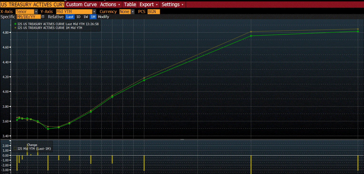 W ujęciu miesiąc do miesiąca krzywa rentowności USA nie zmieniała się istotnie.